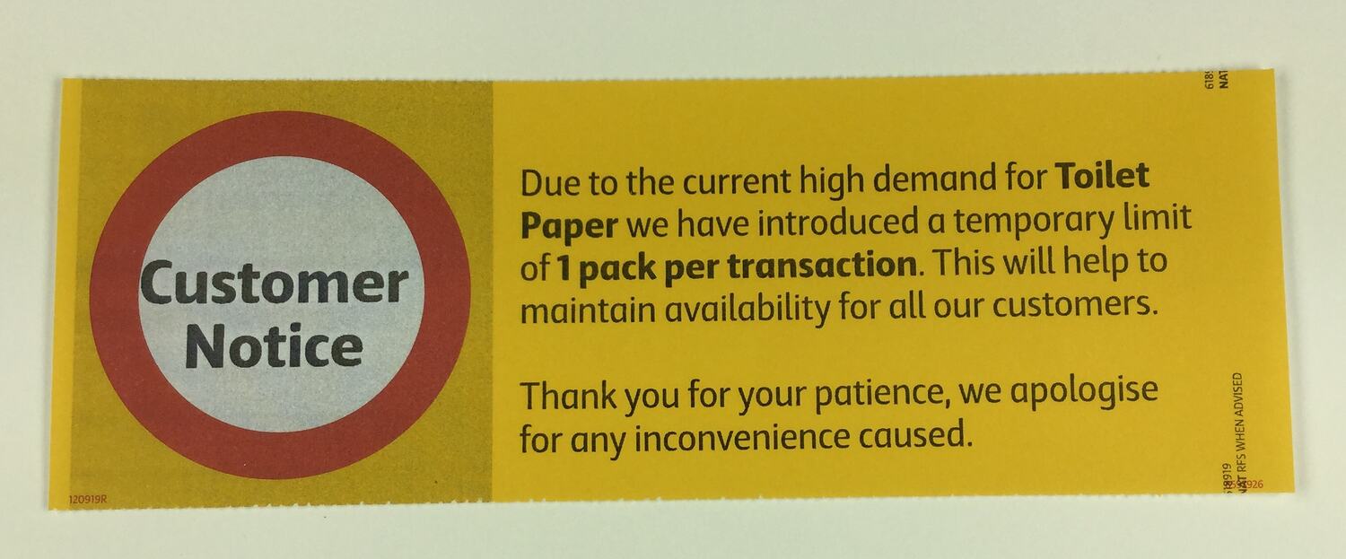 Front, left, printed: White circle and red ring encircling the words in black text, 'Customer / Notice' Front, right, printed, black text: "Due to the current high demand for Toilet / Paper we have introduced a temporary limit / of 1 pack per transaction. This will help to / maintain availability for all our customers. / Thank you for your patience, we apologise / for any inconvenience caused."
