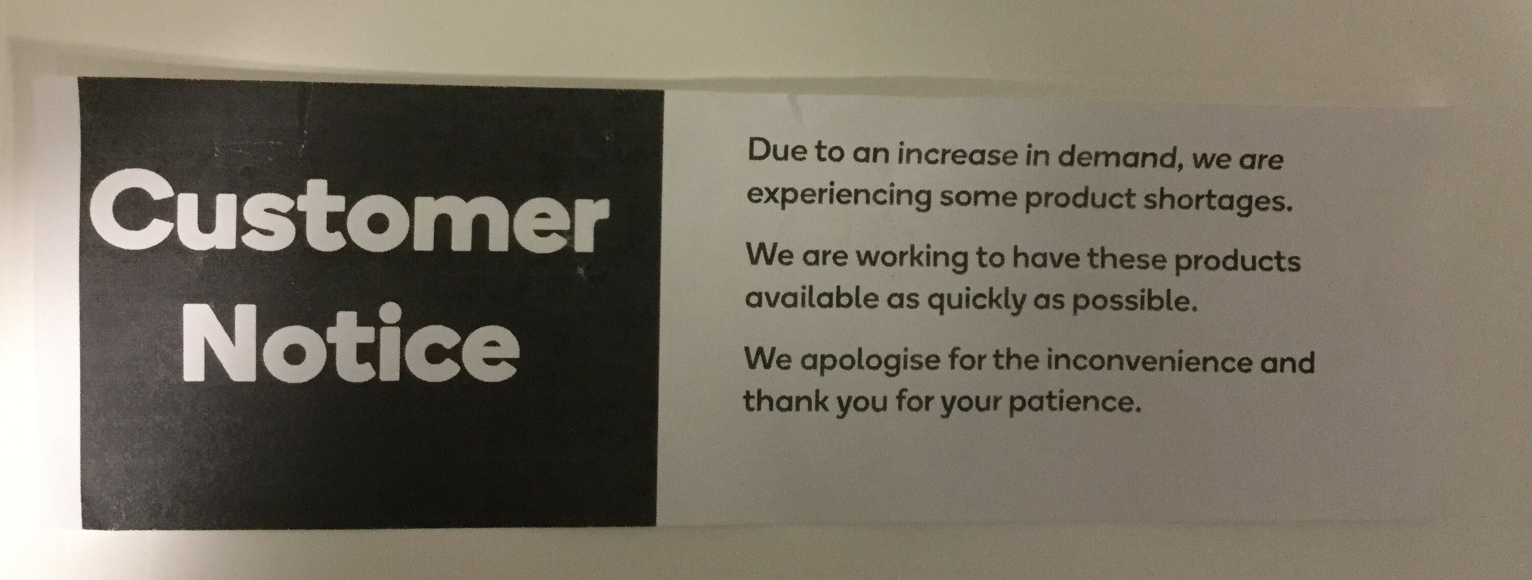 Front, left, printed, ink: Black square background, white ink "Customer / Notice" Front, right, printed, black ink: "Due to an increase in demand, we are / experiencing some product shortages. / We are working to have these products / available as quickly as possible. / We apologise for the inconvenience and / thank you for your patience."