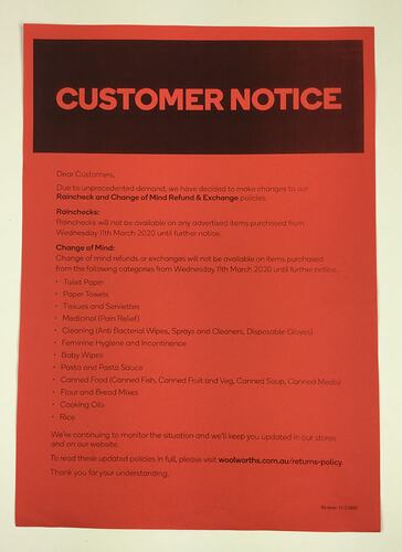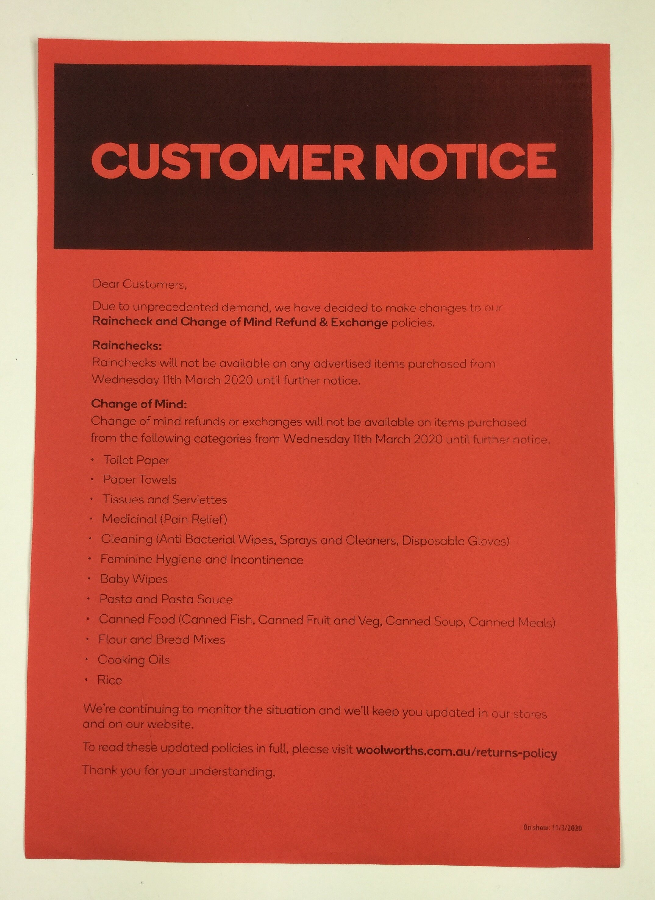 This Customer Notice was issued by Woolworths supermarkets in March 2020 to inform customers of the changes to the store's raincheck and refund policies.