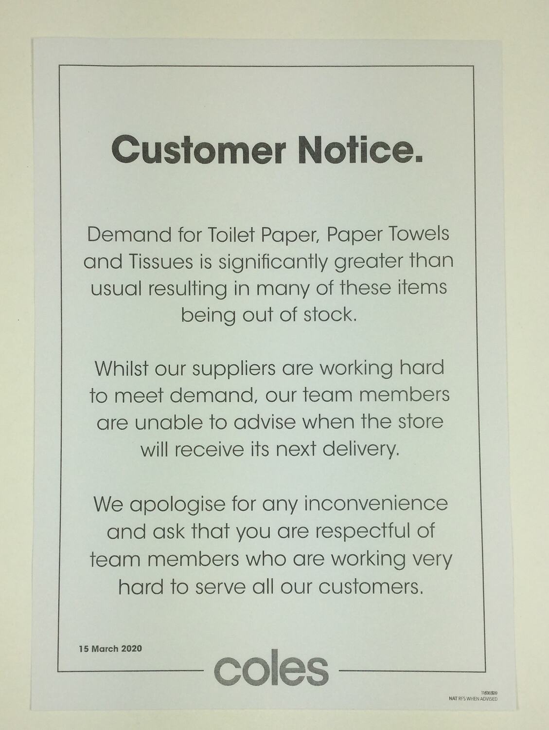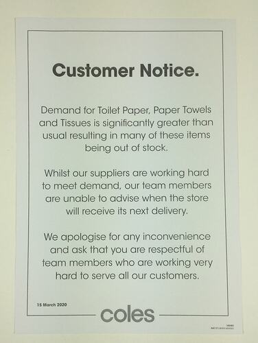 Front, printed, black ink: "Customer Notice. / Demand for Toilet Paper, Paper Towels / and Tissues is significantly greater than / usual resulting in many of these items / being out of stock. / Whilst our suppliers are working hard / to meet demand, our team members /are unable to advise when the store / will receive its next delivery. / We apologise for any inconvenience / and ask that you are respectful of / team members who are working very / hard to serve all our customers. / 15 March 2020 / coles