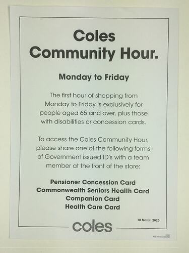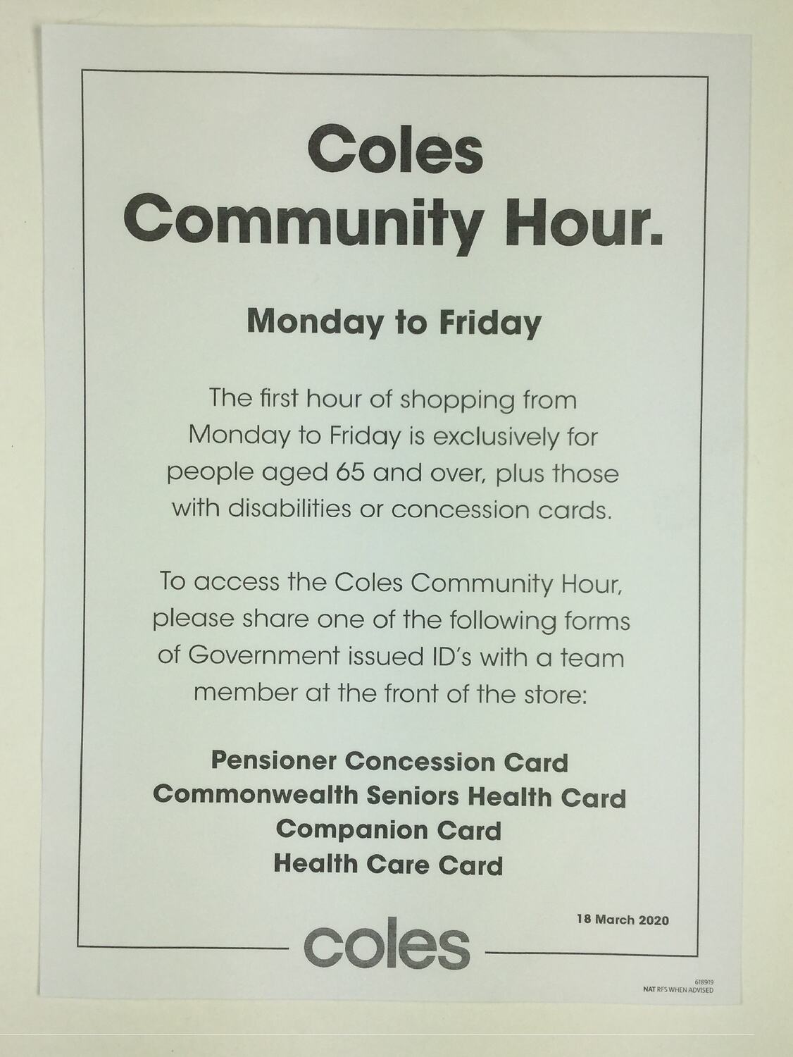 Notice regarding the introduction of Coles Community hour for seniors, people with disabilities and concession cards at Coles supermarkets. This measure was introduced during the COVID-19 pandemic to allow these more vulnerable groups to shop with reduced crowds and to ensure more stock was available.
