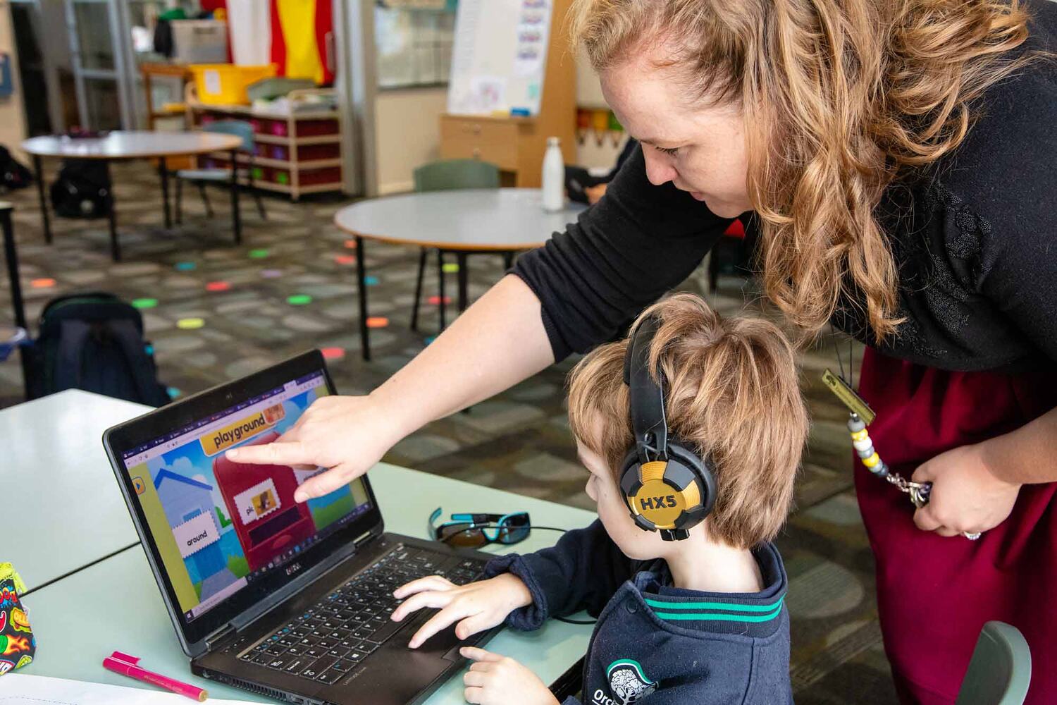 Teacher pointing to a laptop screen showing a young child a program. They work together in a mostly empty classroom.