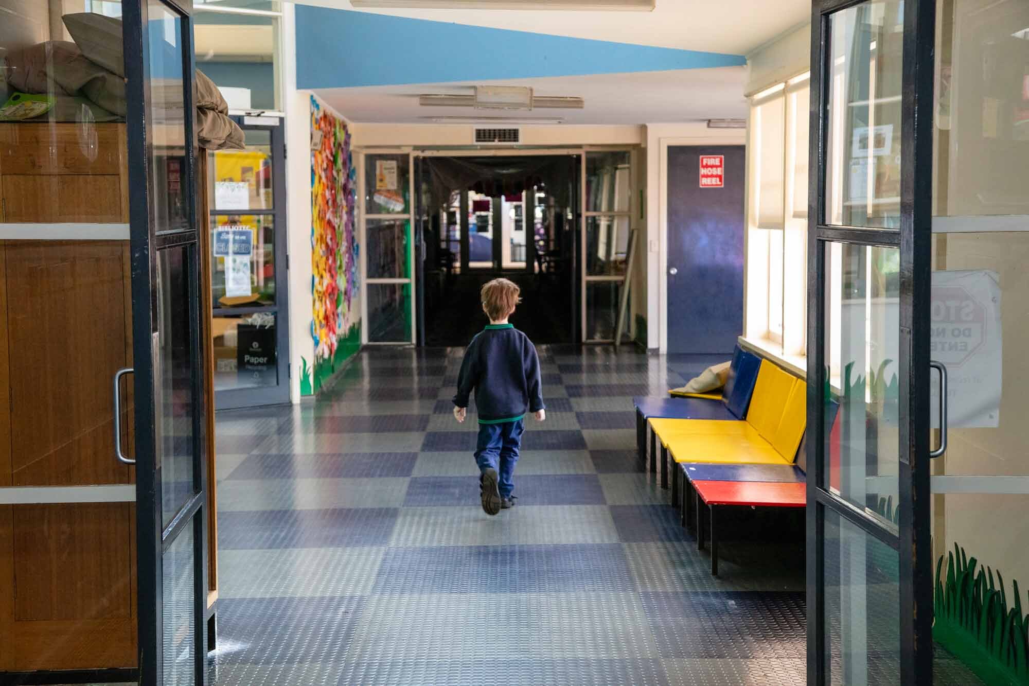 Young boy walking alone in empty school hallway.
