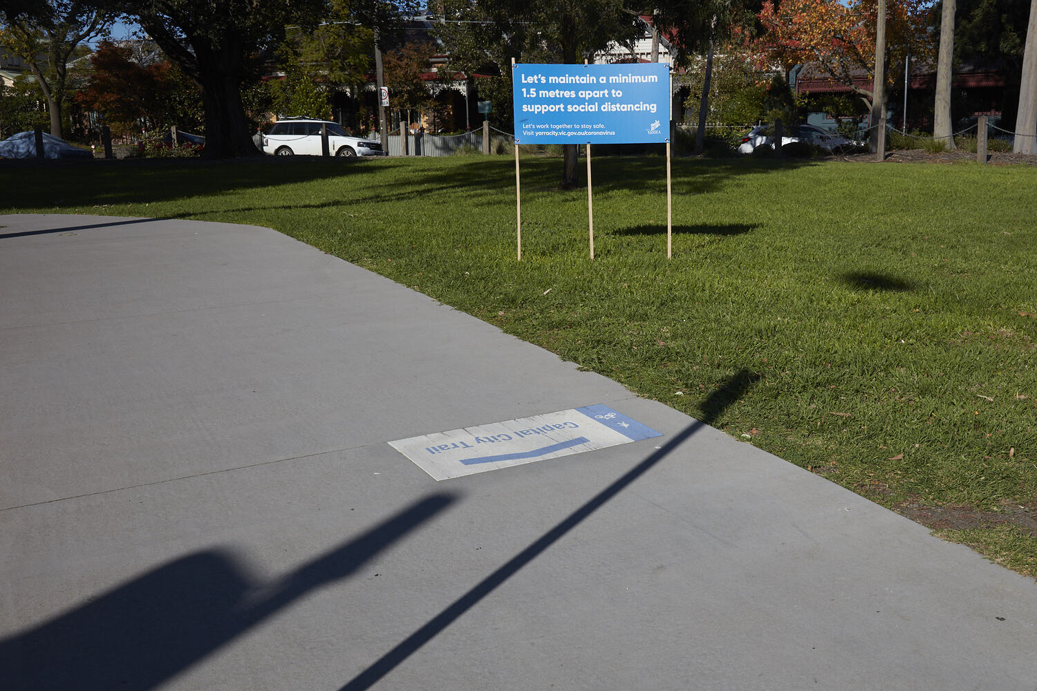One of a series of photographs taken by Museums Victoria staff photographer Jon Augier as part of a project to document the experiences of Victorians during the COVID-19 pandemic. This image illustrates the simple and widespread public health messaging used during the 2020 COVID-19 pandemic to encourage Victorians to practice social distancing to help flatten the COVID-19 curve. The sign a physical reminder of how much space people should leave between themselves and others.