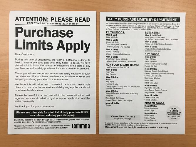 Black and white double sided printed A5 paper listing the daily limits for purchasing products to ease panic buying.