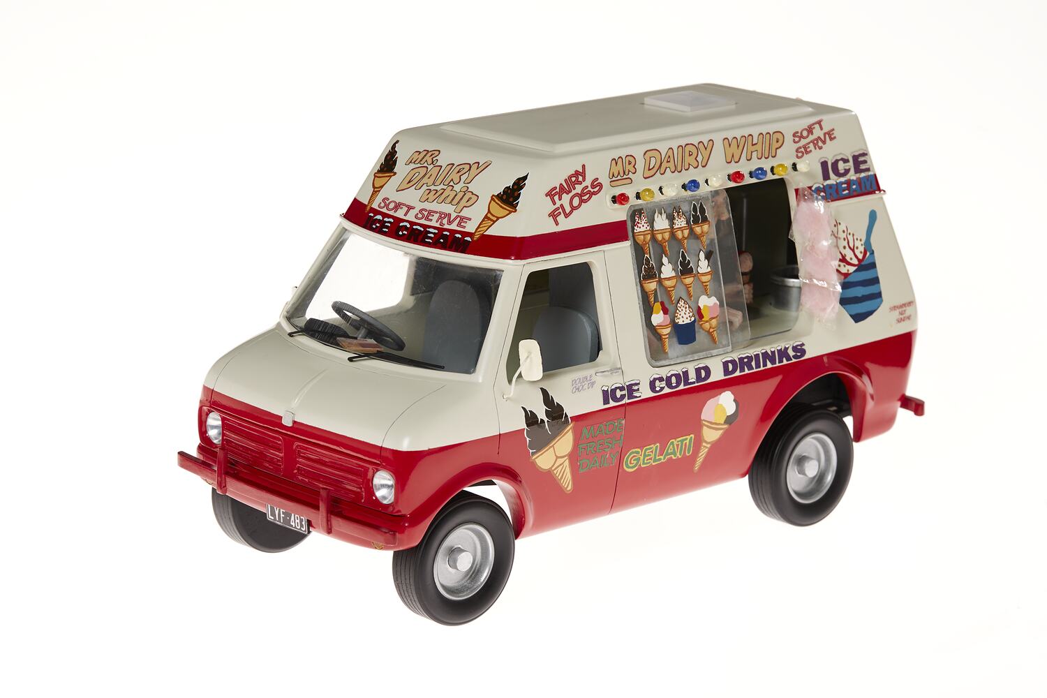 This model is of a CF Bedford ice cream van, which travelled the streets of Melbourne in the 1970s. The originals were made in Australia by Holden, using one of their engines.
