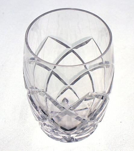Crystal water set. Used by Her Majesty Queen Elizabeth II and HRH The Duke of Edinburgh during their stay at O'Shannassy Quarters (Lodge/Chalet/Weir Quarters), 6 to 8 March 1954, during their Australian tour. The set was displayed in crystal cabinet SH 940005.