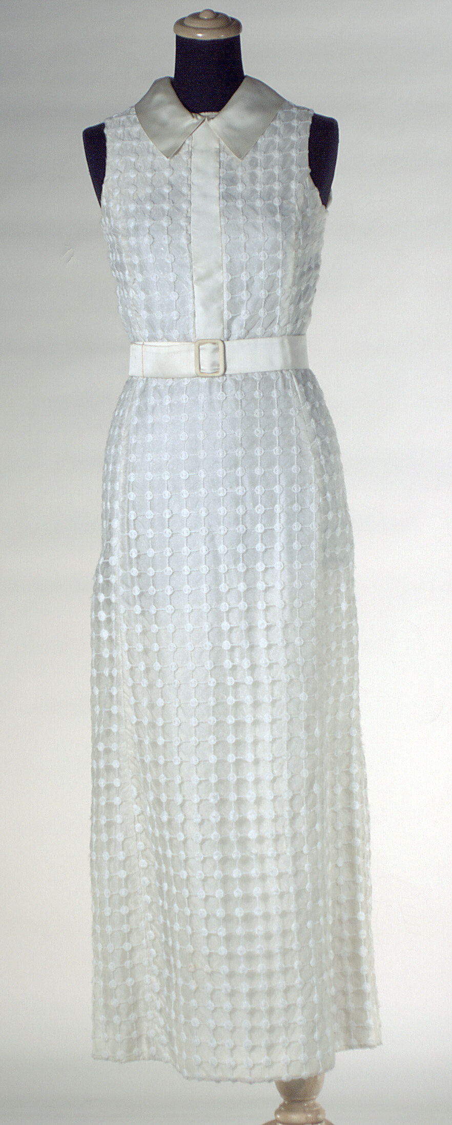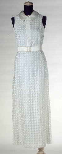 Sleeveless ankle-length dress in cream satin overlaid with transparent polyester decorated with cream squares. Cream satin strip at front bodice and satin collar. Fastened at back with metal zip. .2 Belt of cream satin. Square metal buckle covered in same fabric.