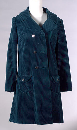 Jade green corduroy double-breasted coat dress with military look buttons. Coat is mini length. Two flap patch pockets at front with button decorating flap. One row of buttons is missing from the front. Lined in olive green polyester.