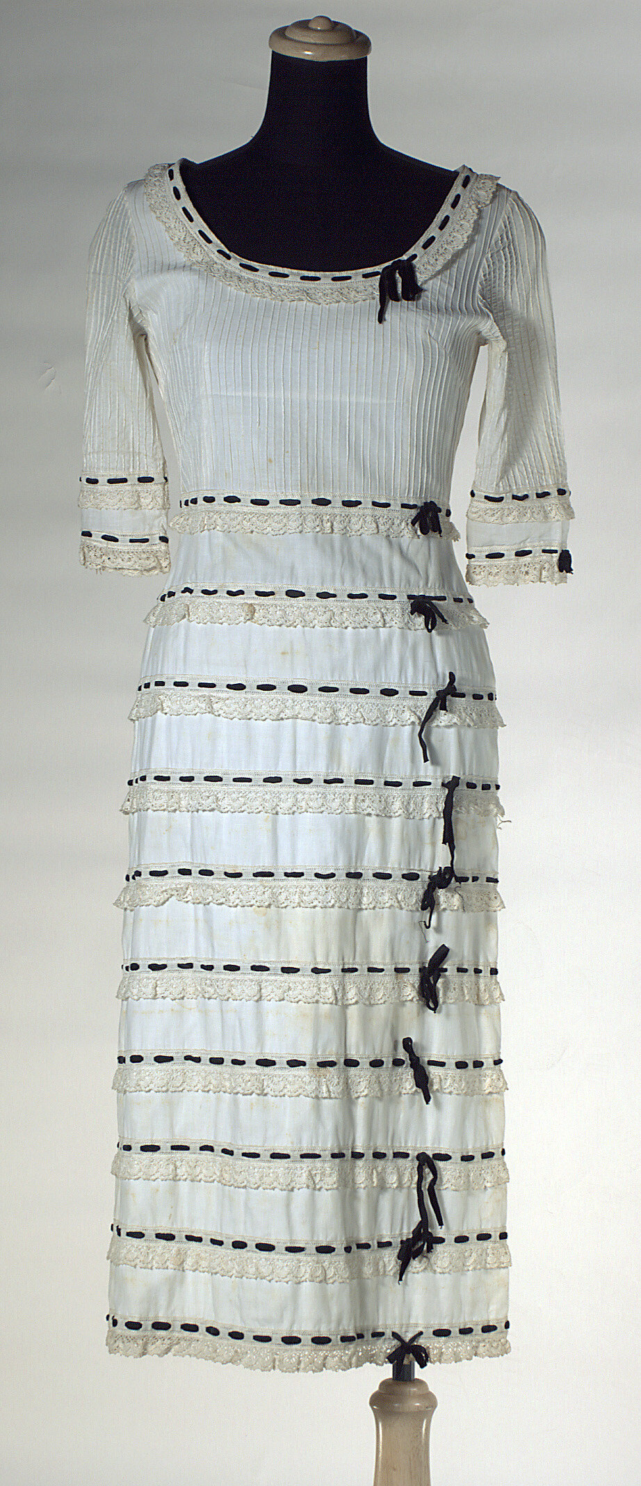 Cream coloured cotton mid-calf length dress trimmed with cream lace and black velvet ribbon. The dress has a scooped neck and elbow-length sleeves. Bodice is decorated with pin-tucks. Zip-fastened at back.