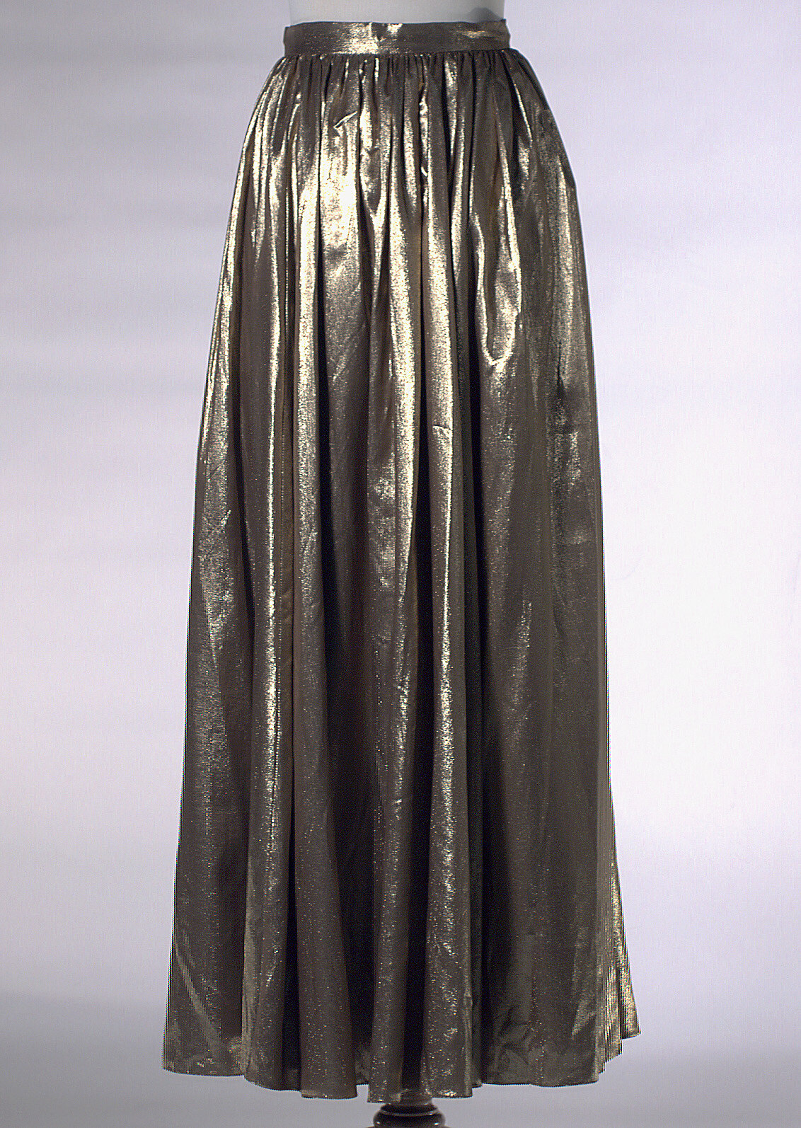 Floor-length evening skirt in gold lame, backed with bronze coloured silk. Skirt is gathered into waistband and is fastened at the back with a zip and two hook-and-eyes. Two gold straps sewn inside waistband, to hang.