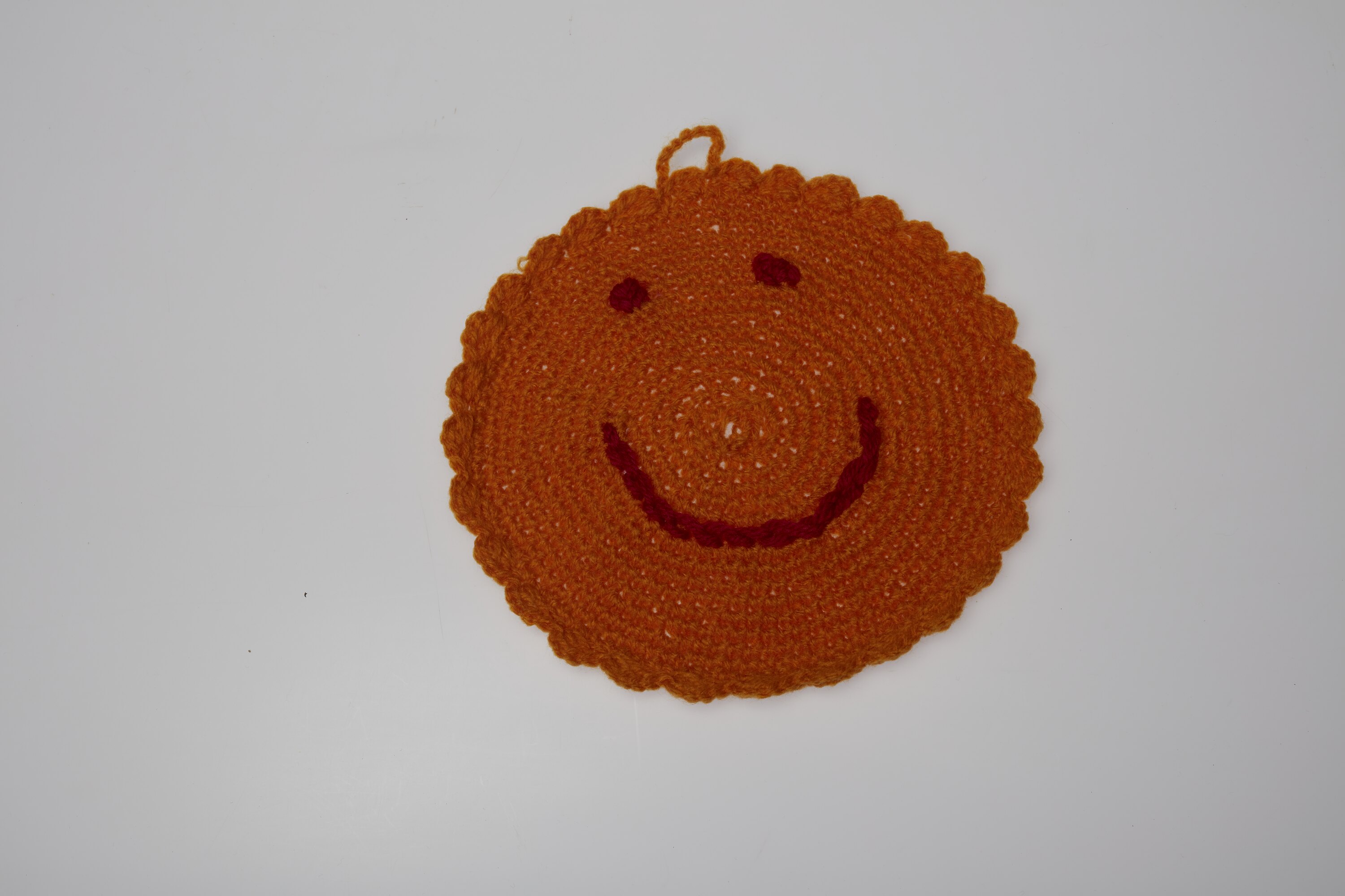 During the pandemic 'My mum was staying with my sister and they noticed rainbow pictures and teddy bears being displayed in windows, so decided that she wanted to crochet something bright and happy, so an orange sun circle with a smile was created so it could be displayed in my sisters window to lift peoples spirits. Also, at the time of the first lockdown it almost felt for her like being in wartime when she was a young girl, so the lifting of spirits was what she wanted to achieve. She chose orange and a circle because it was the connection to the sun and the sun makes you smile hence she then put a face on the sun.'