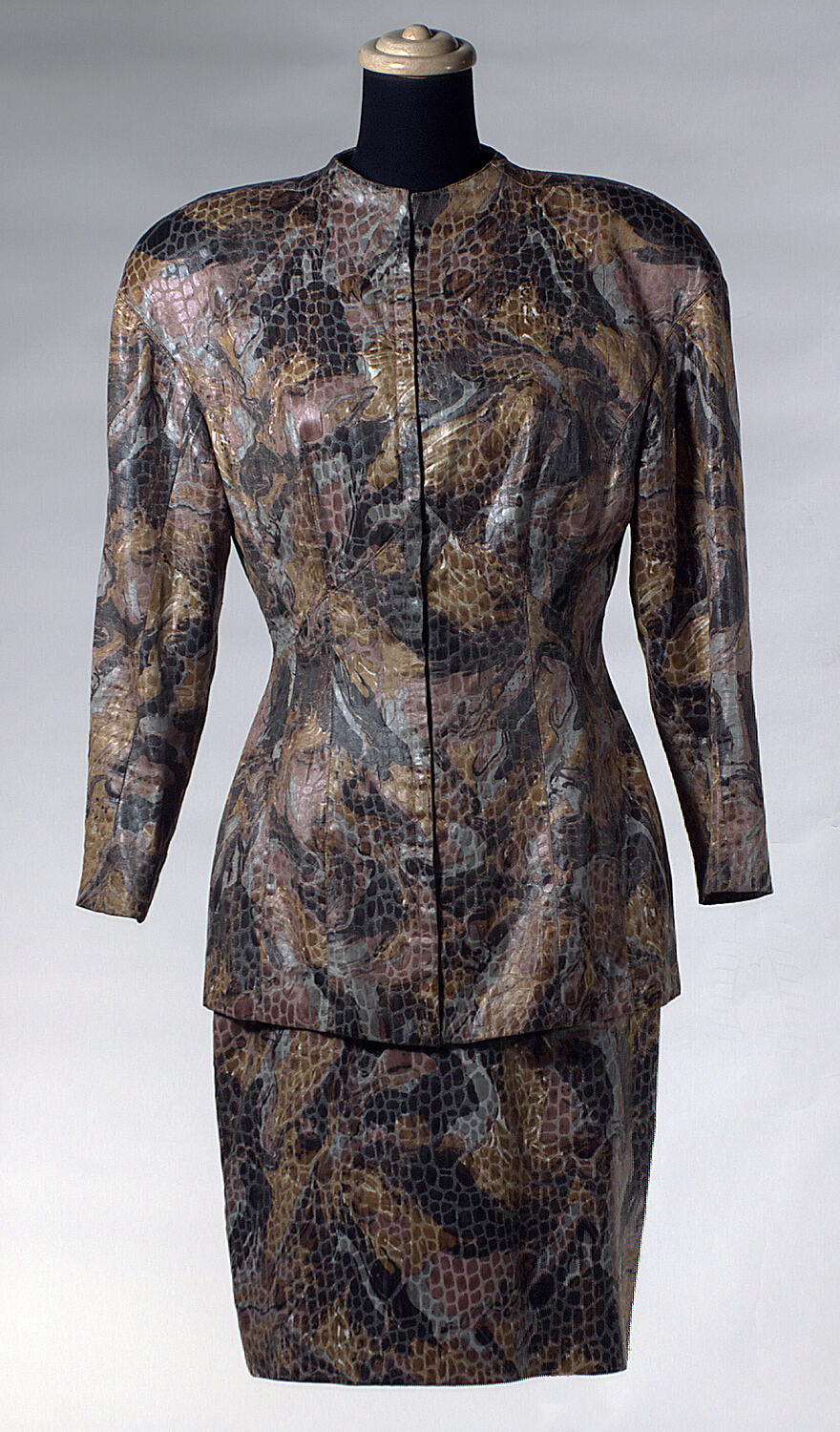 Worn by donor. Same design as brown faux reptile outfit worn to 1986 Melbourne Cup by donor. (which has zip at front) See skirt 94.2478 in collection.