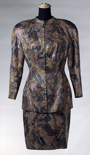 Two piece women's skirt suit in faux reptile fabric coloured in different shades of brown and grey: (1) Collarless long-sleeved jacket, fitted, fastening at front with hook-and-eye. Big shoulder pads inside shoulders. (2) Straight cut knee-length skirt. Fastened at backk with zip and metal clasp. Slit at lower back.