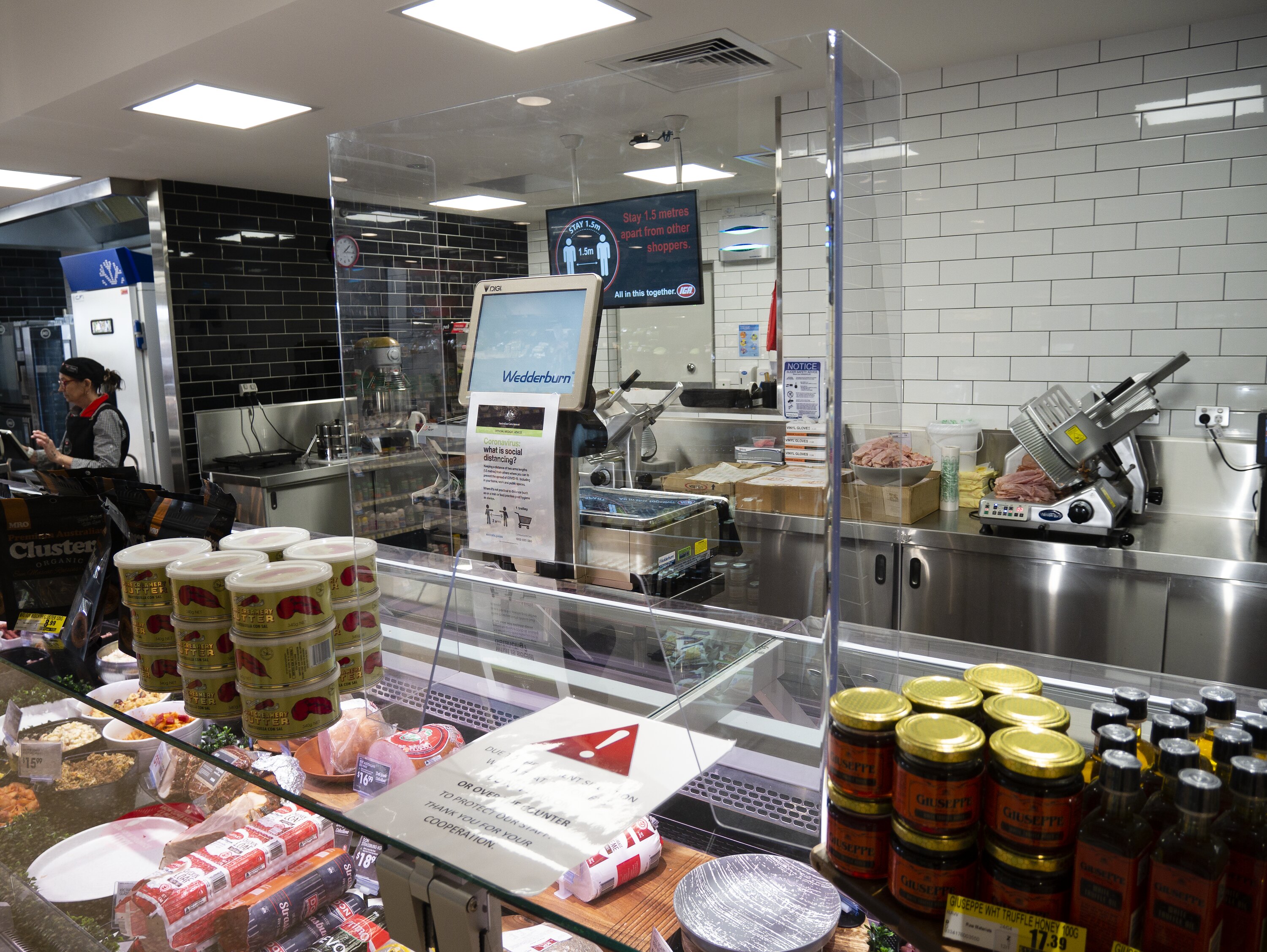 Supermarket delicatessen counter with perspex sneeze screen in front of a weighing station and a female staff member at left. There is a notice attached to the front of the screen on the scales, and another notice on the counter where the sneeze screen is.