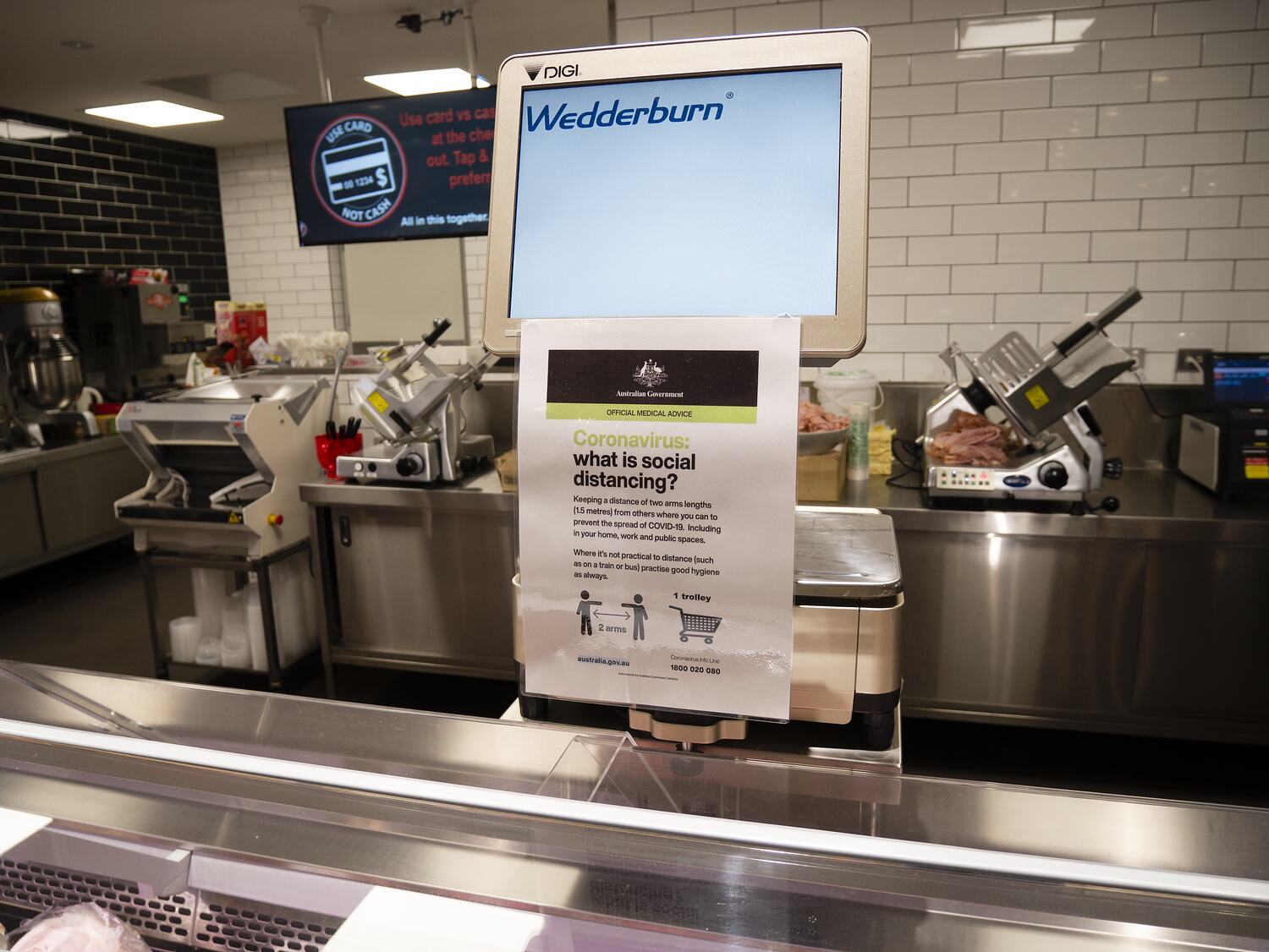 Photograph of a customer notice with information on social distancing and corona virus, behind a sneeze screen at a weighing station at the delicatessen at Creswick IGA Plus Liquor Store, in regional Victoria. The notice suggests using a shopping trolley as a guide for suitable social distancing length between people.