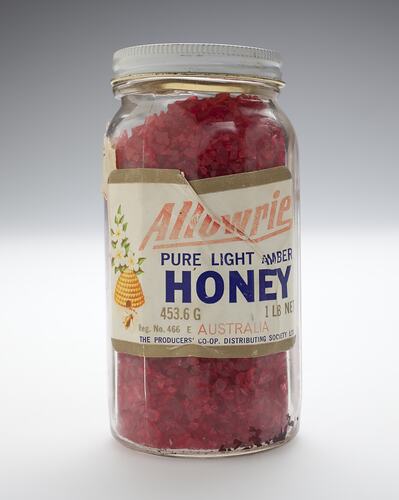 Paper label, printed: Allowrie/PURE LIGHT AMBER/HONEY/453.6G 1 LB NET/Reg No. 466 E AUSTRALIA/THE PRODUCERS' CO-OP. DISTRIBUTING SOCIETY LTD.