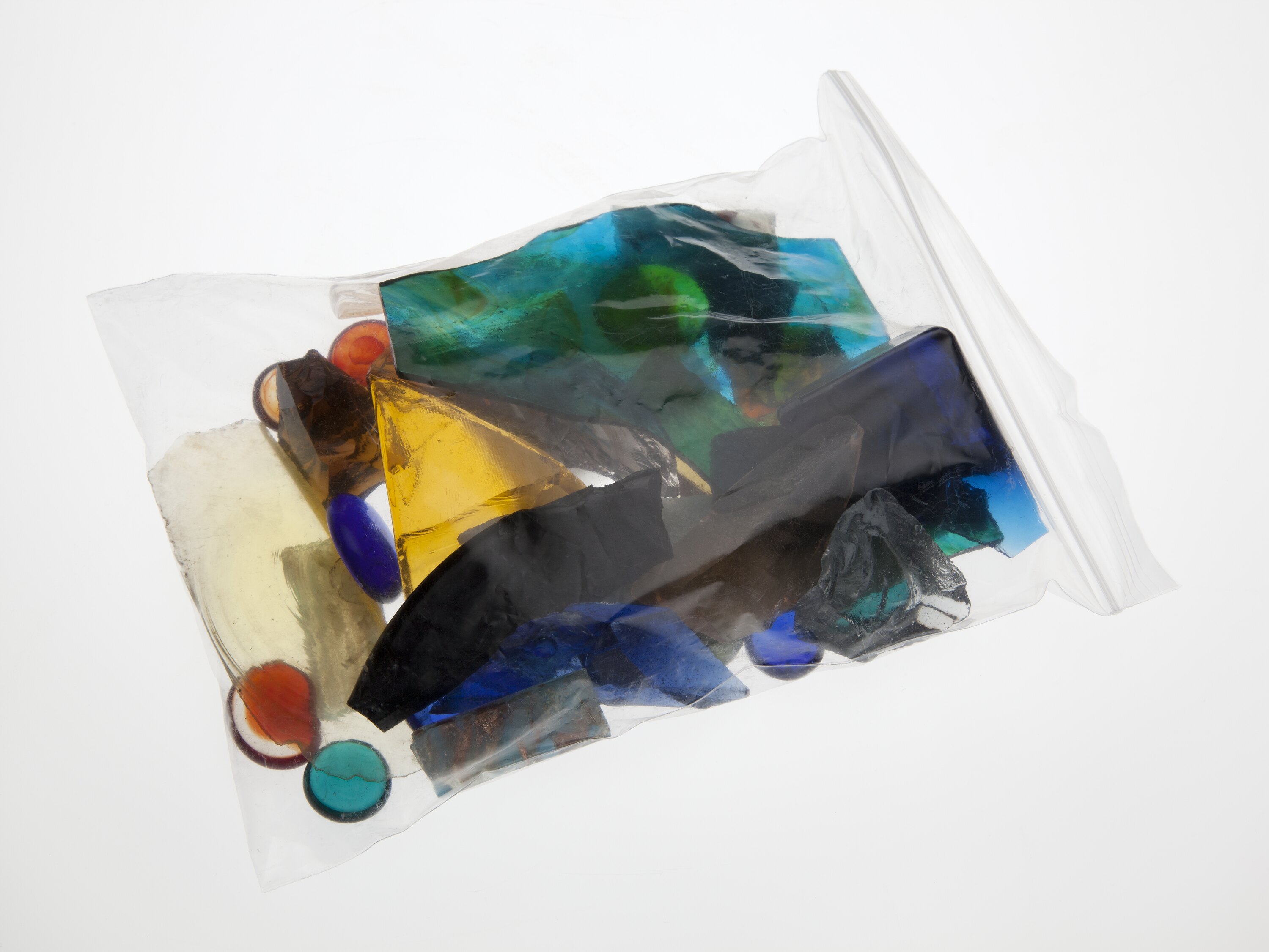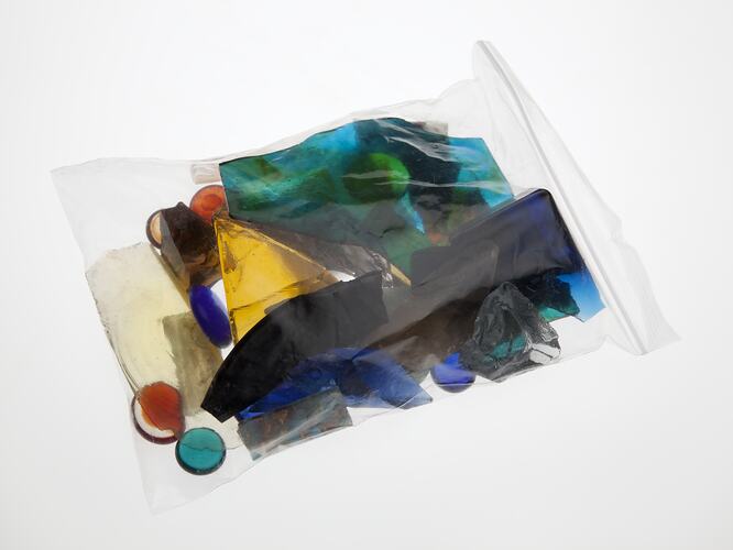 Collection of various glass pieces in a variety of colours used by artist Martha Ash circa 1996. Martha Ash was born in Poland in 1920 and lost all her family in the Holocaust. She came to Australia in 1949 where she studied ceramics, sculpture silver smithing, enamelling and glass mosaic work. These glass pieces were used as part of her glass mosaic work.