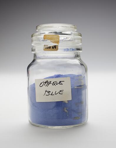 Jar of opaque blue pigment used by artist Martha Ash, circa 1996. Martha Ash was born in Poland in 1920 and lost all her family in the Holocaust. She came to Australia in 1949 where she studied ceramics, sculpture silver smithing, enamelling and glass mosaic. This pigment was used in the enamelling process. Martha Ash died in September 1996.
