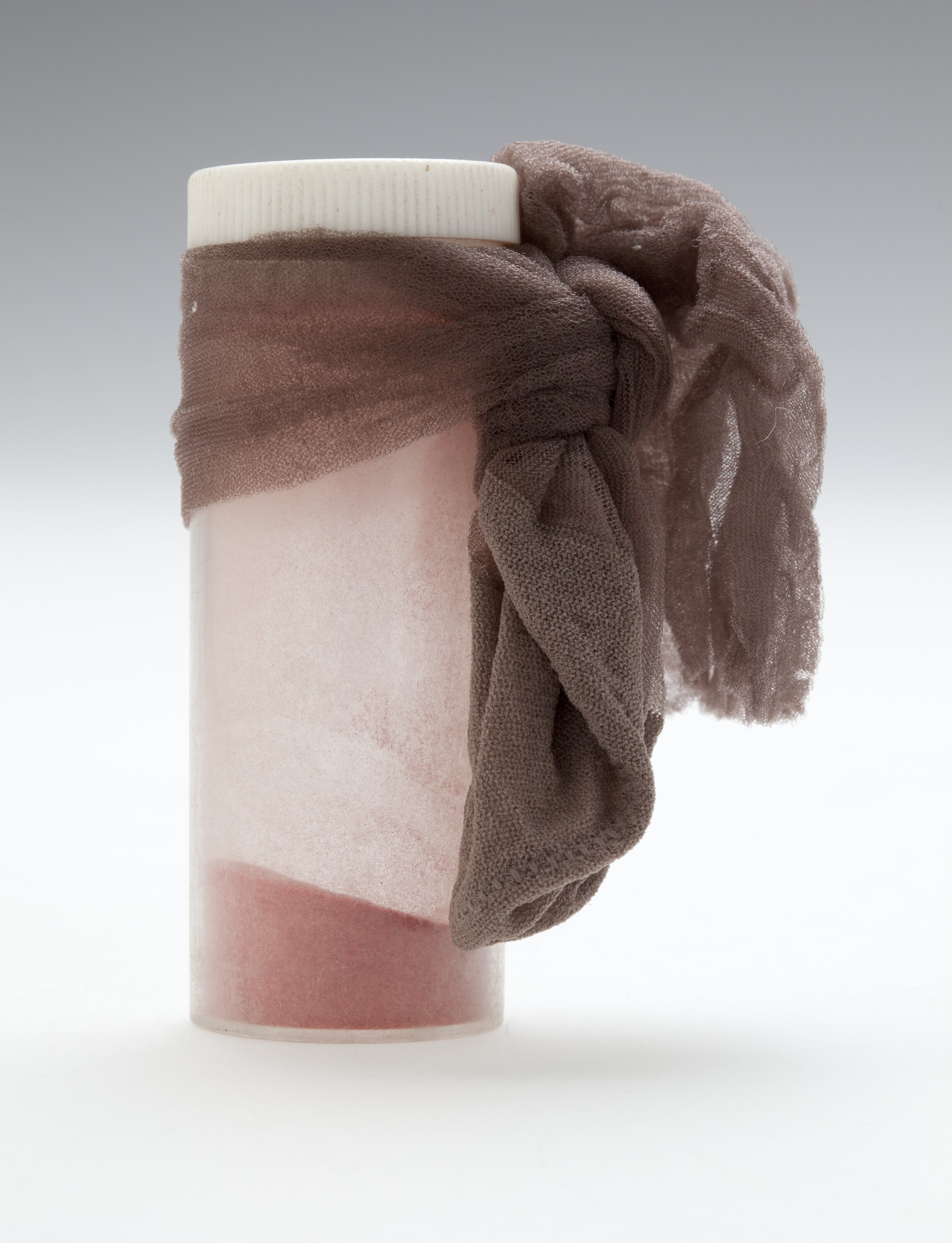 Small clear plastic jar with screw on white plastic lid filled with a small amount of red pigment and lid tied around with a piece of brown pantyhose. Lid is marked with colour label.