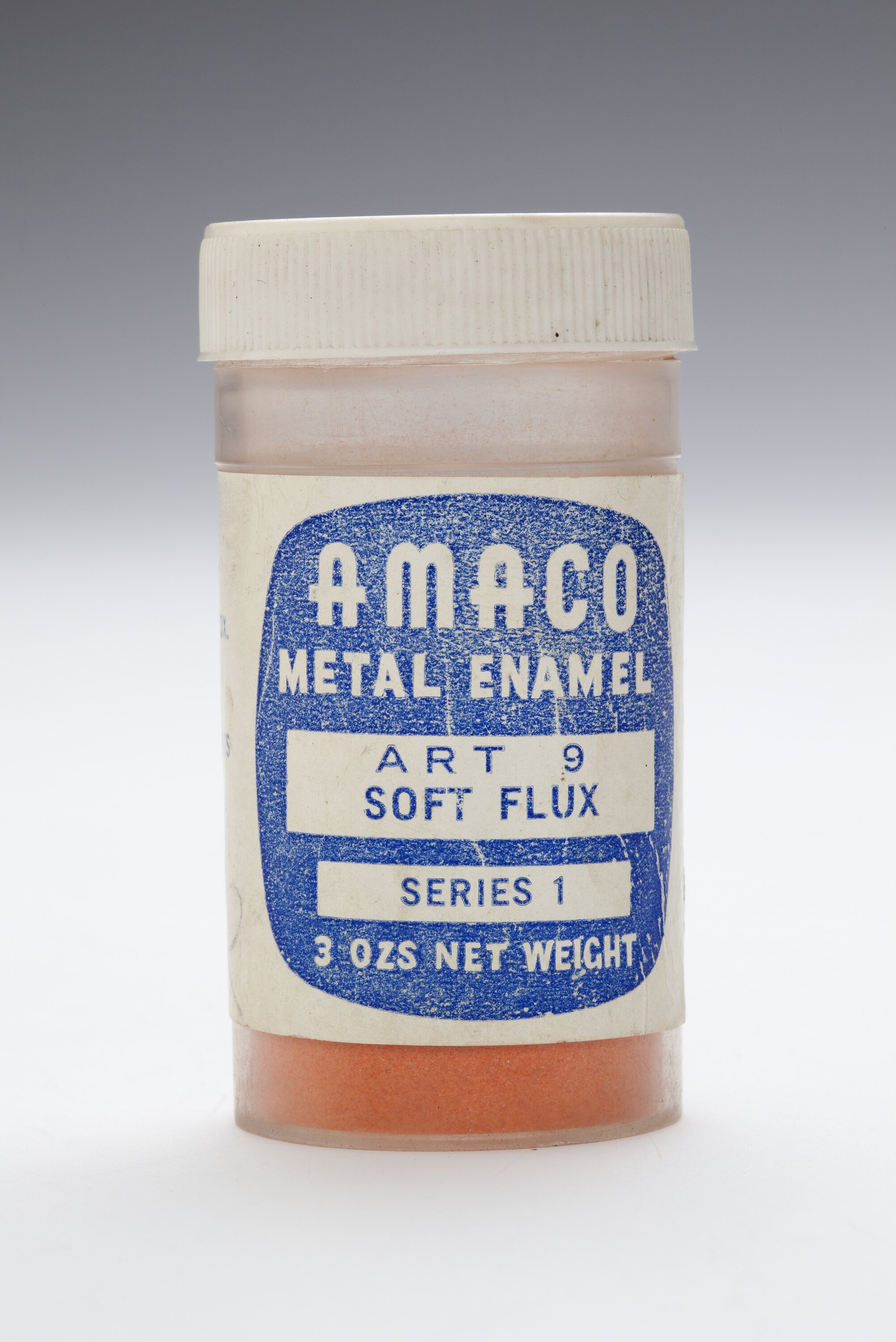 Handwritten on lid: WHITE. Printed on label: AMACO/METAL ENAMEL/AFT 9/SOFT FLUX/SERIES 1 /3 OZS NET WEIGHT.