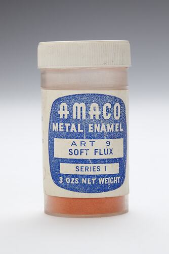 Jar of orange pigment made by Amaco, used by artist Martha Ash, circa 1996. Martha Ash was born in Poland in 1920 and lost all her family in the Holocaust. She came to Australia in 1949 where she studied ceramics, sculpture silver smithing, enamelling and glass mosaic. This pigment was used in the enamelling process. Martha Ash died in September 1996.