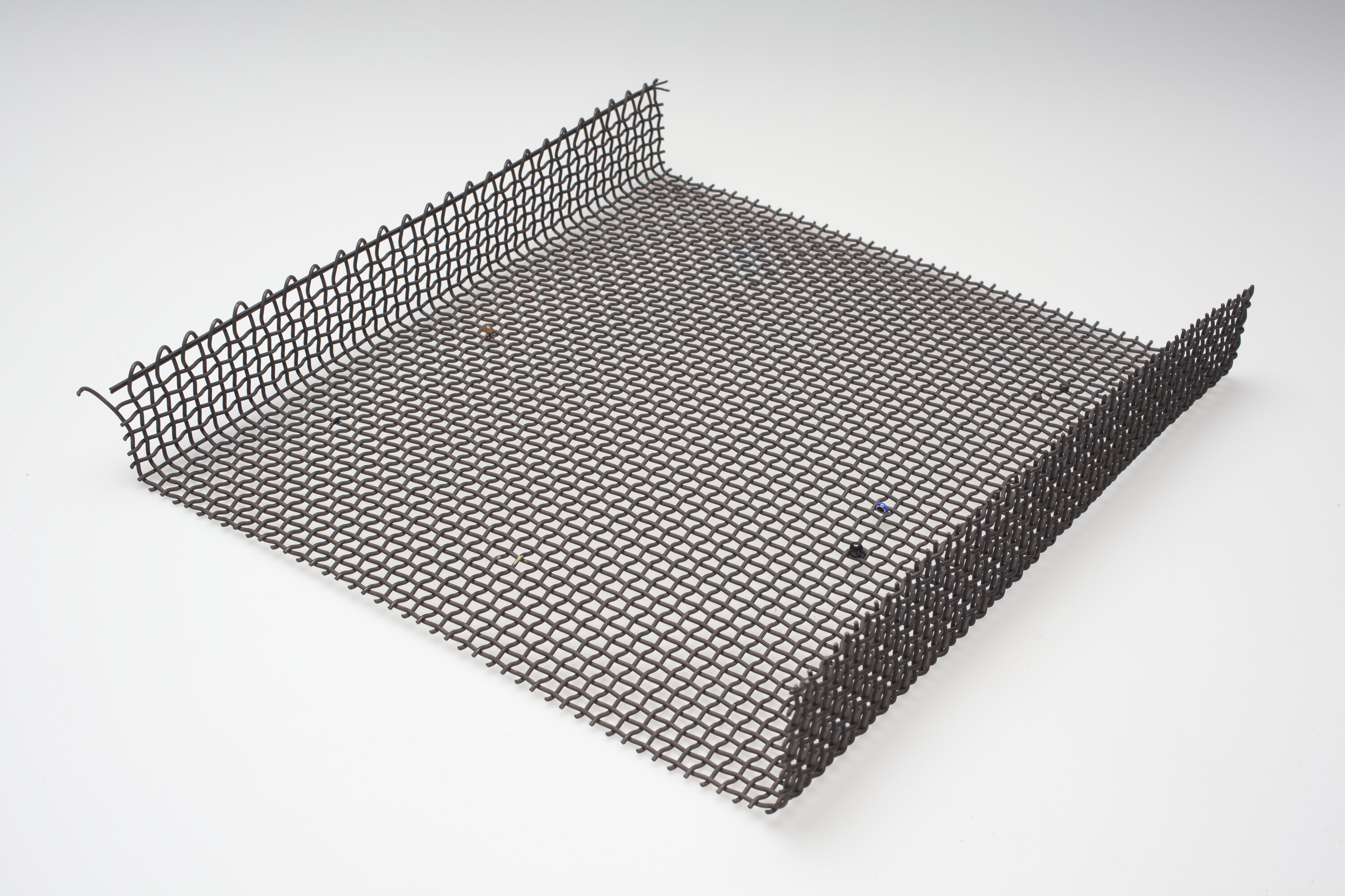 Large wire mesh stand used in the firing of enamel pieces in a kiln. Some fired globules of metal enamel remain between the wire mesh. Sides of mesh are bent under to form legs.