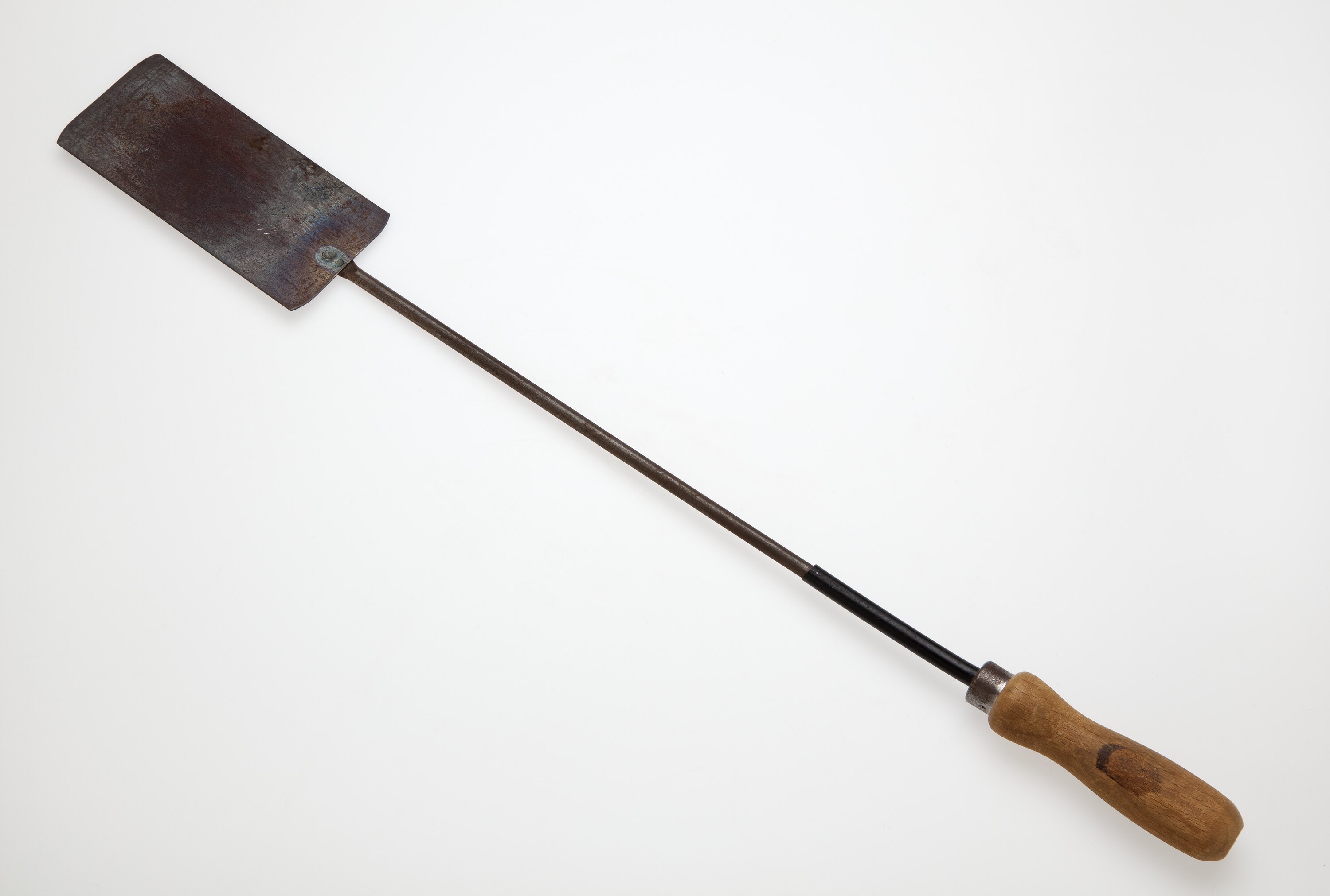 Tool used in enamelling process with turned wooden hand, metal neck and long metal rod to which is attached a flat piece of metal.