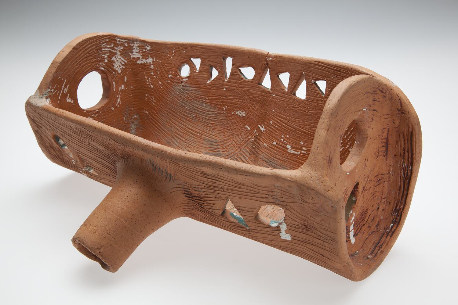 Terracotta container used in firing process. Container is roughly made with long open neck on one side to enable a rod to be inserted and container drawn out of the kiln. Holes have been cut out on all sides of container to permit even flow of heat around the items inside.