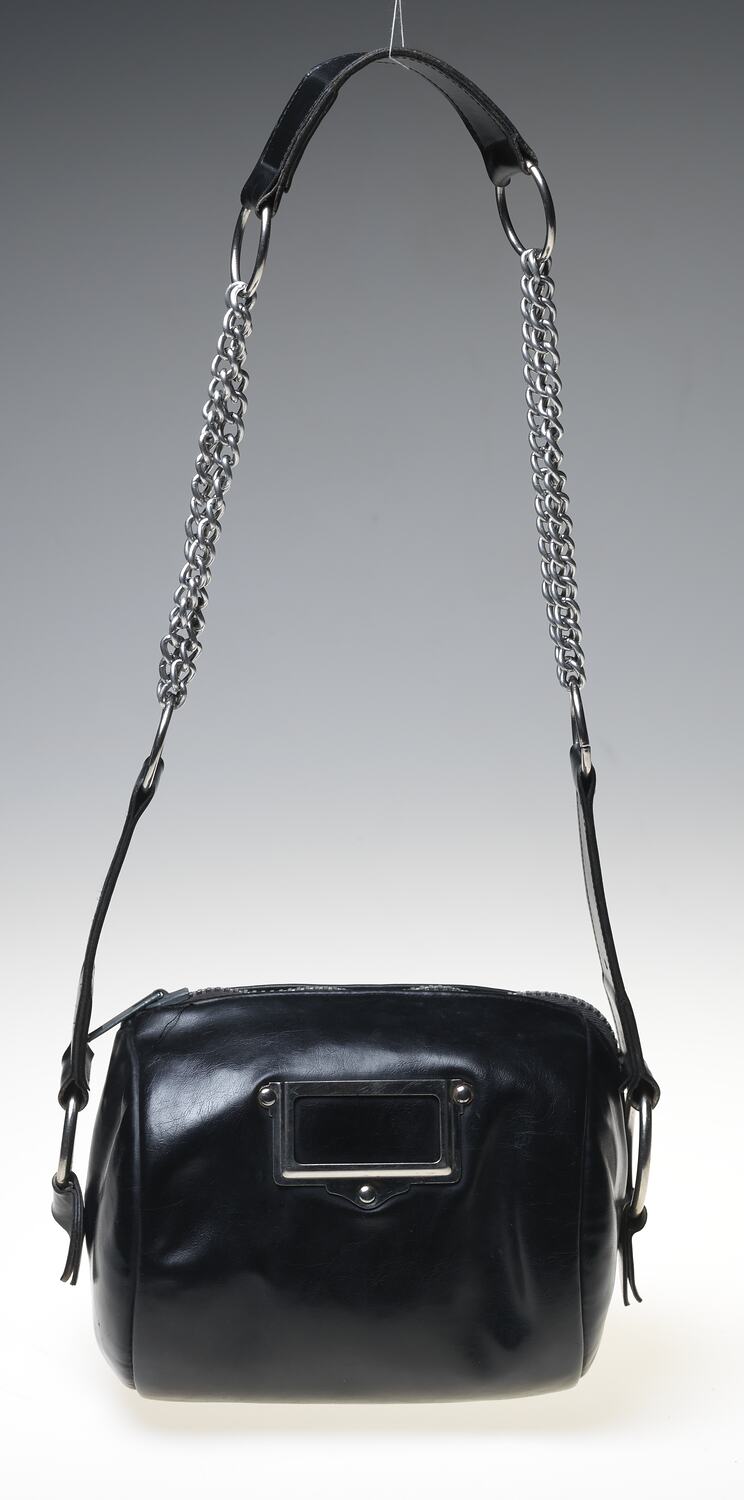 Black leather cylindrical shoulder-strap bag with metallic zippered fastening across top and right side. Centre front is a metal rectangular shaped name plate facility. The shoulder strap is attached with metal rings to each side of bag and consists of leather shapes and chains attached to metal rings.