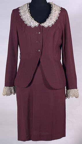 The suit consists of a linen mini jacket and mini skirt. (1) Burgundy linen fitted suit jacket with cream coloured lace collar and sleeve cuffs. One of the three small metal and pearl buttons fastening the front is missing, as is the buckled belt. The lining is burgundy polyester. (2) Burgundy linen mini straight hipster skirt with zippered back fastening.