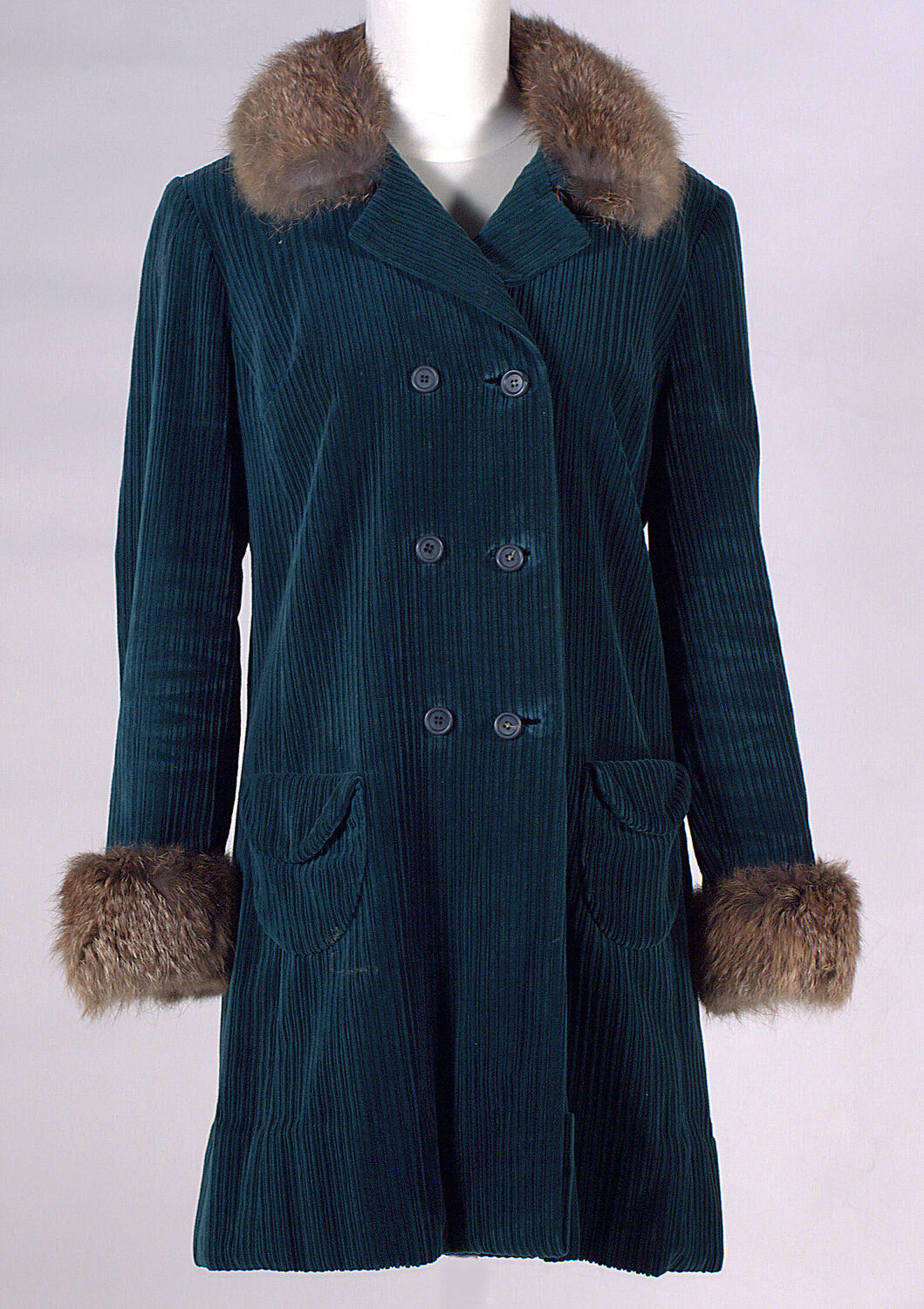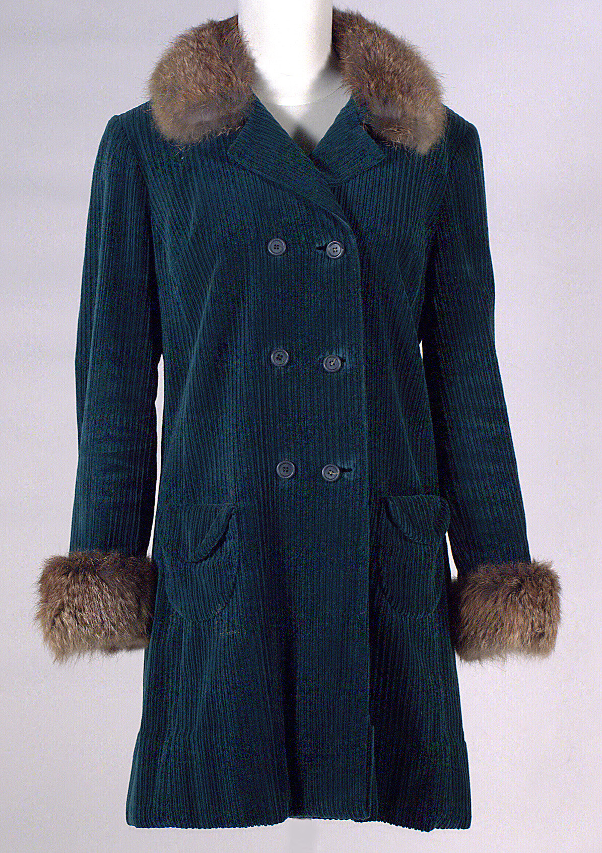 Emerald green double-breasted corduroy velvet mini coat with fox fur collar and cuffs. On the front are six green plastic buttons and two flap pockets. The coat is lined with green rayon.