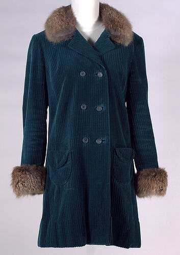 This coat was designed and manufactured in Melbourne by Prue Acton P/L in 1967. It was worn by the donor when pregnant with first daughter.