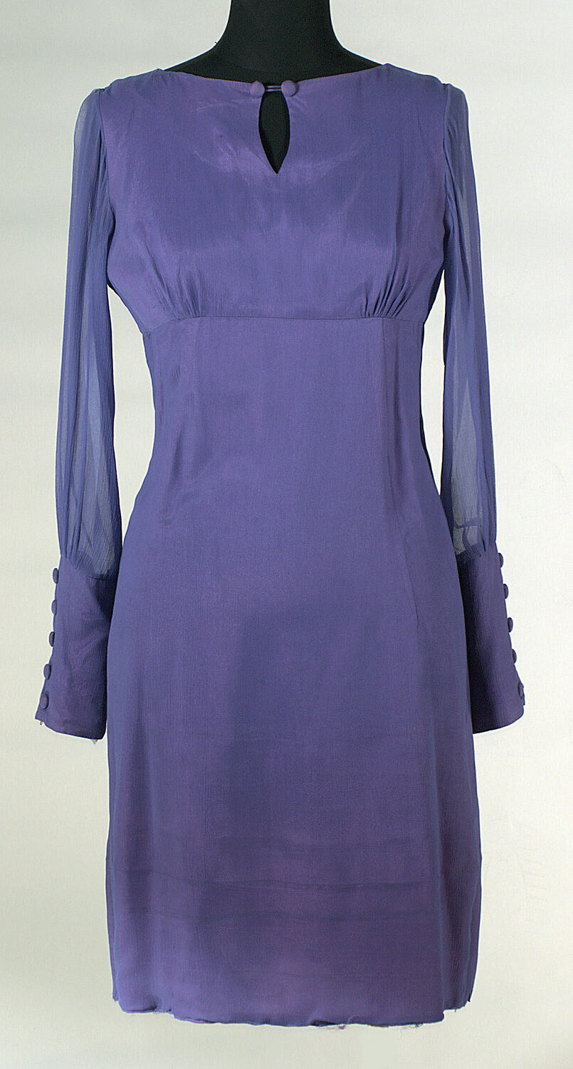 Purple Empire line mini dress with transparent sleeves. Large cuffs on sleeves with covered buttons (false opening) covering a zip opening. Front neck has decorative non-functional slit with two self-covered buttons and loop-fastening. Long zip at centre back.