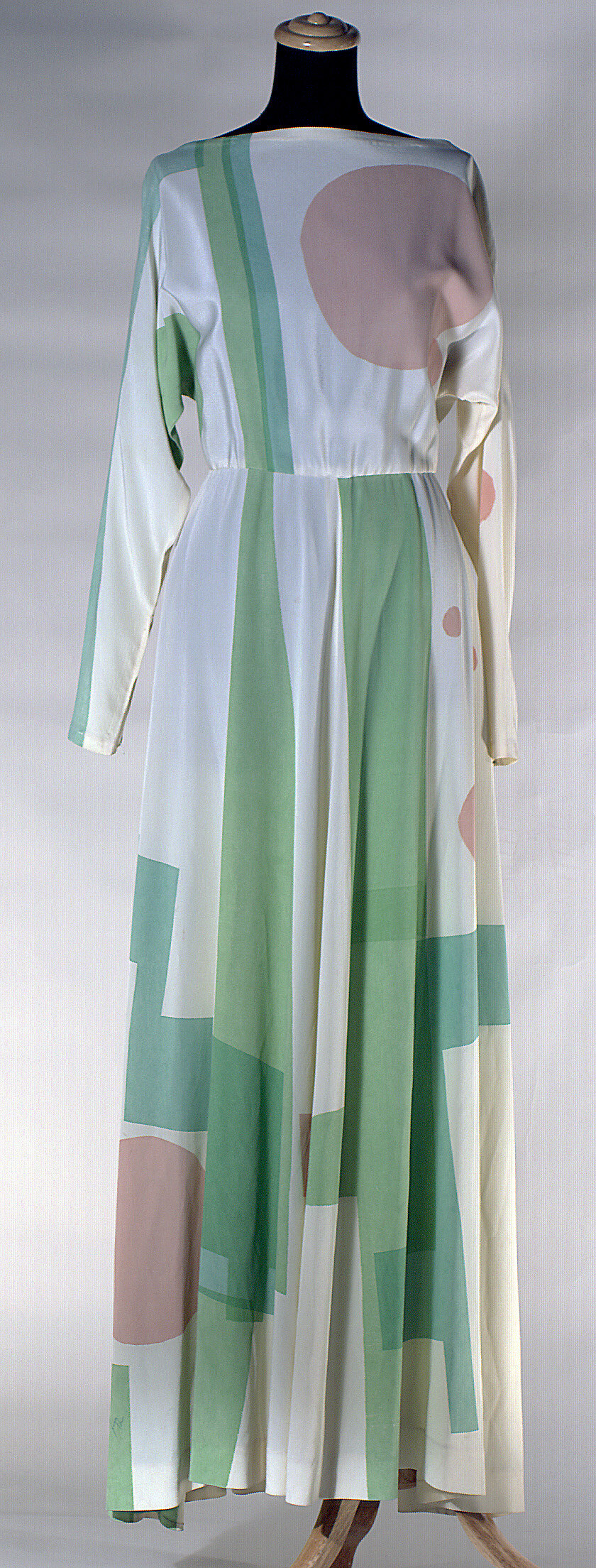 Full length long-sleeved crepe evening dress. The bodice featuring Dolman sleeves is fitted at the waist. Geometric shapes in pale greens and pink are printed all over on cream background. The zippered opening is from the centre back. The narrow sleeves have zippered openings at wrist. The belt is missing.