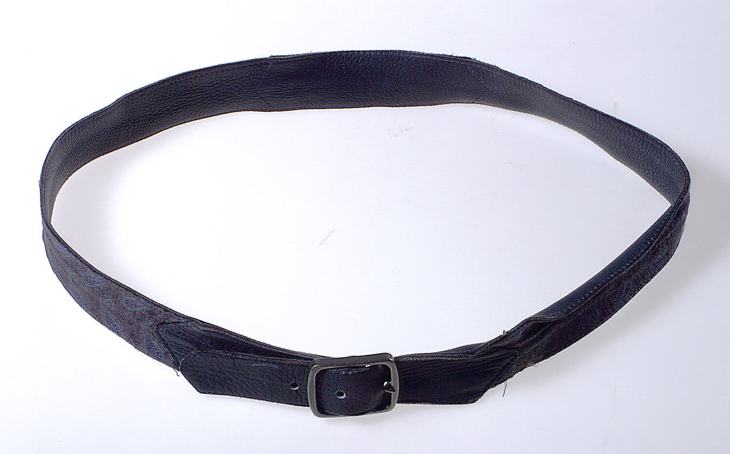 Leather and fabric belt in navy blue with "paisly" design. Back of belt is leather, with leather inserts on front. Grey metal buckle at one end, three holes at the other.
