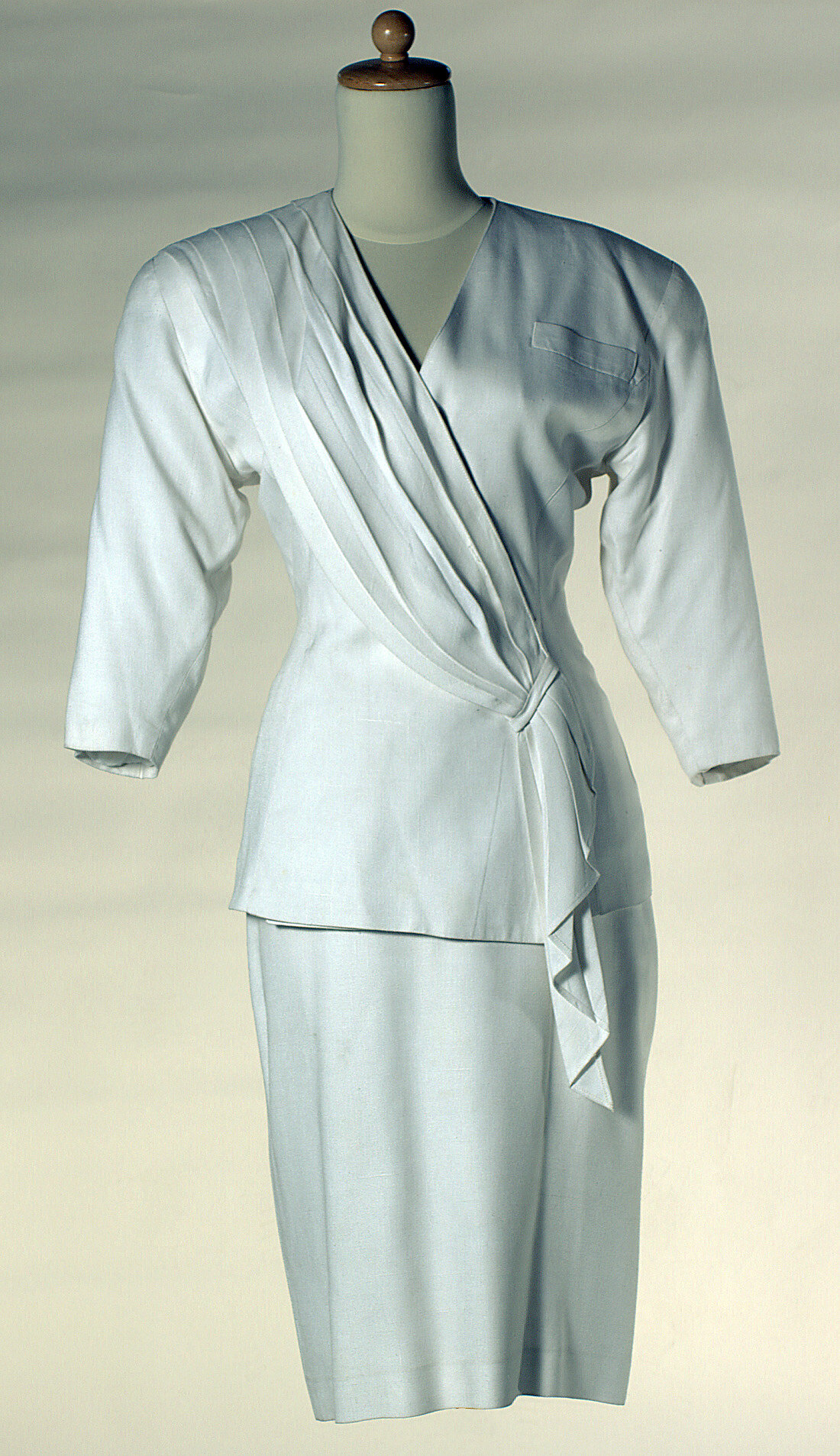 This outfit consists of a white rayon/linen blended top and skirt: (1) White rayon-linen collarless jacket with pleated sash draped from left shoulder secured at right side of waistline and hanging in folds to jacket hemline. Jacket front is wrap around fastened with hooks and eyes and buttons. Therer is a breast pocket on the right side. Lining is white polyester with large shoulder pads. (2) Matching straight skirt, below knee in length with inverted v-shaped split at lower centre back. The skirt is lined with white polyester.