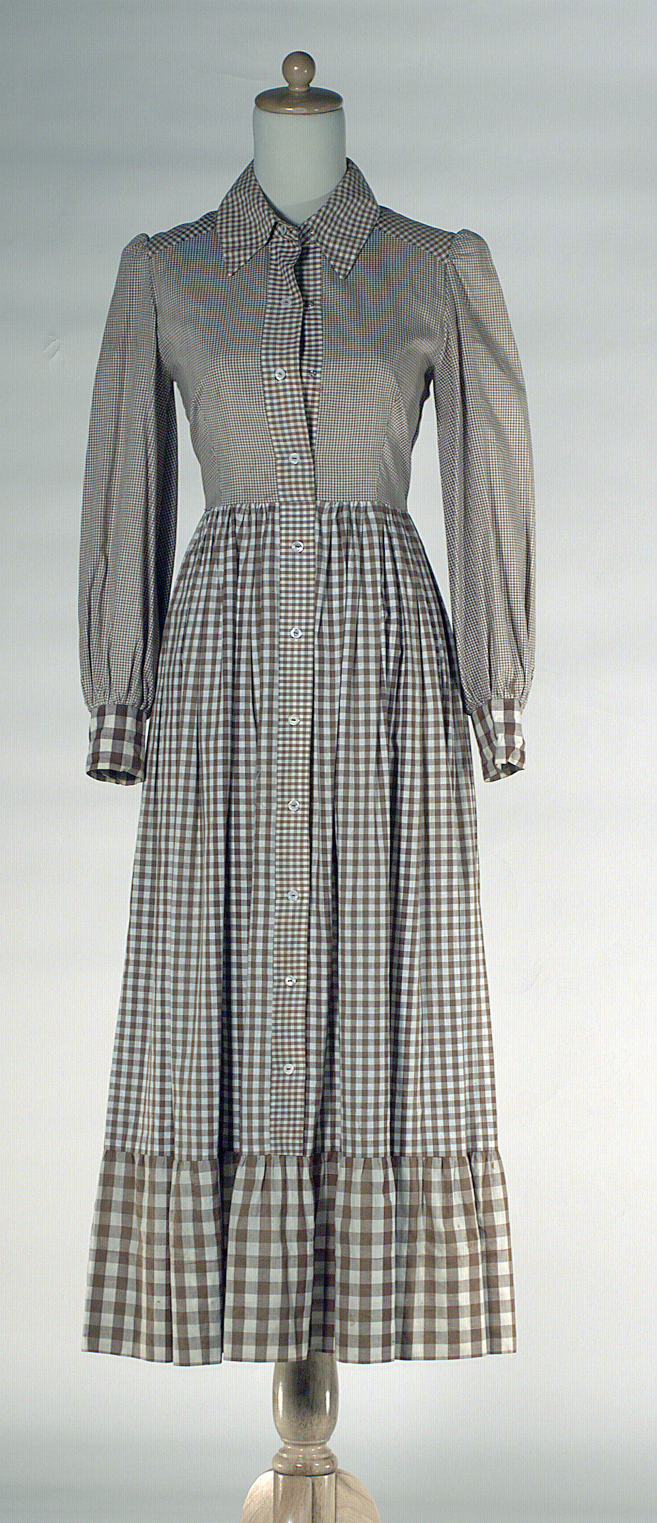 Long-sleeved brown gingham shirt dress, slightly gathered from waistline. Wide ruffle at hem. Eleven small pearl buttons at front opening. Each portion of garment has slightly contrasting gingham.