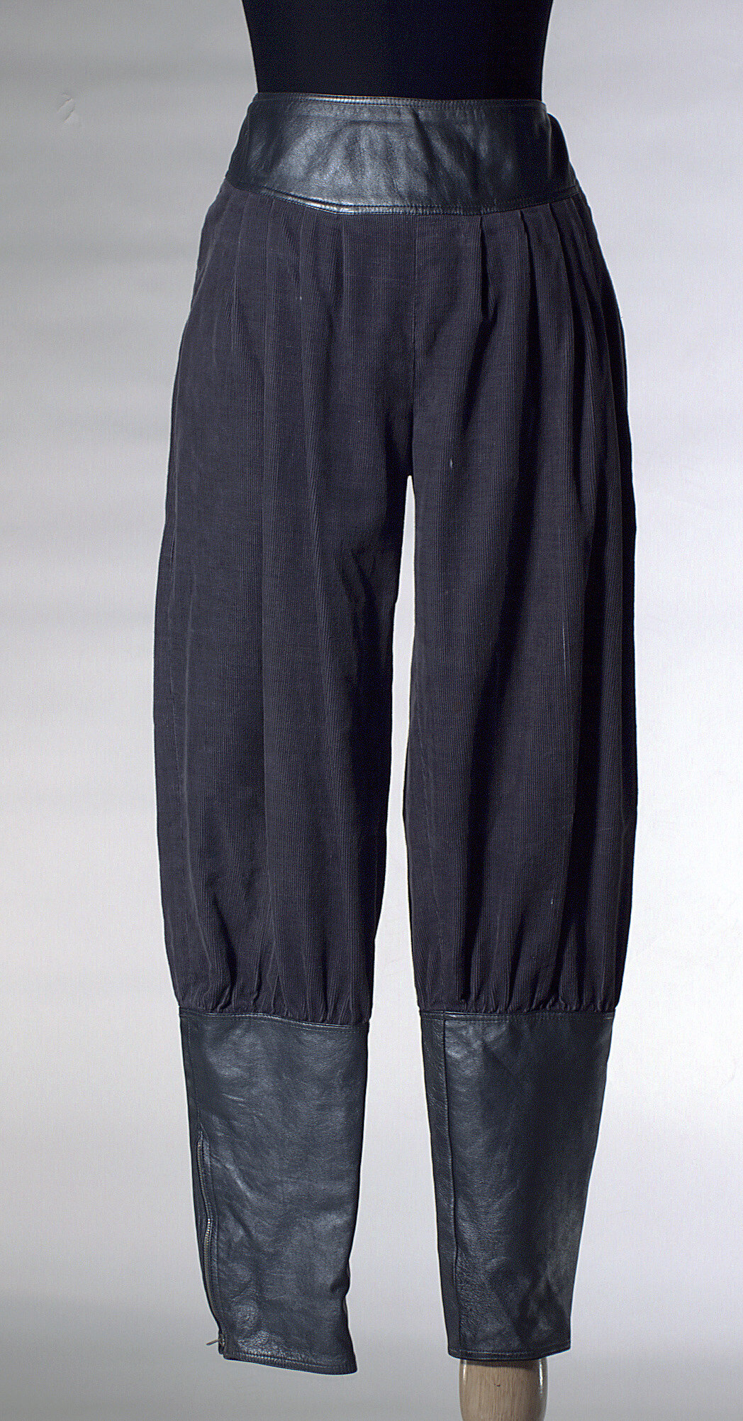 Two piece grey wool pant suit: (1) Knee length charcoal grey swing coat, cotton with metallic grey leather trim at pockets and cuffs. Coat is cut very full, falling from the shoulders, with puffed sleeves and deep cuffs. Front is fastened with grey mother-of-pearl buttons. Coat has shoulder pads and is lined in grey corduroy. (2) Charcoal grey corduray pants, cut full to the knee then tight. Wide waist band and calves are of metallic grey leather. Back fastened by a zip and hook- and- eye. Zips also from knee to ankle.