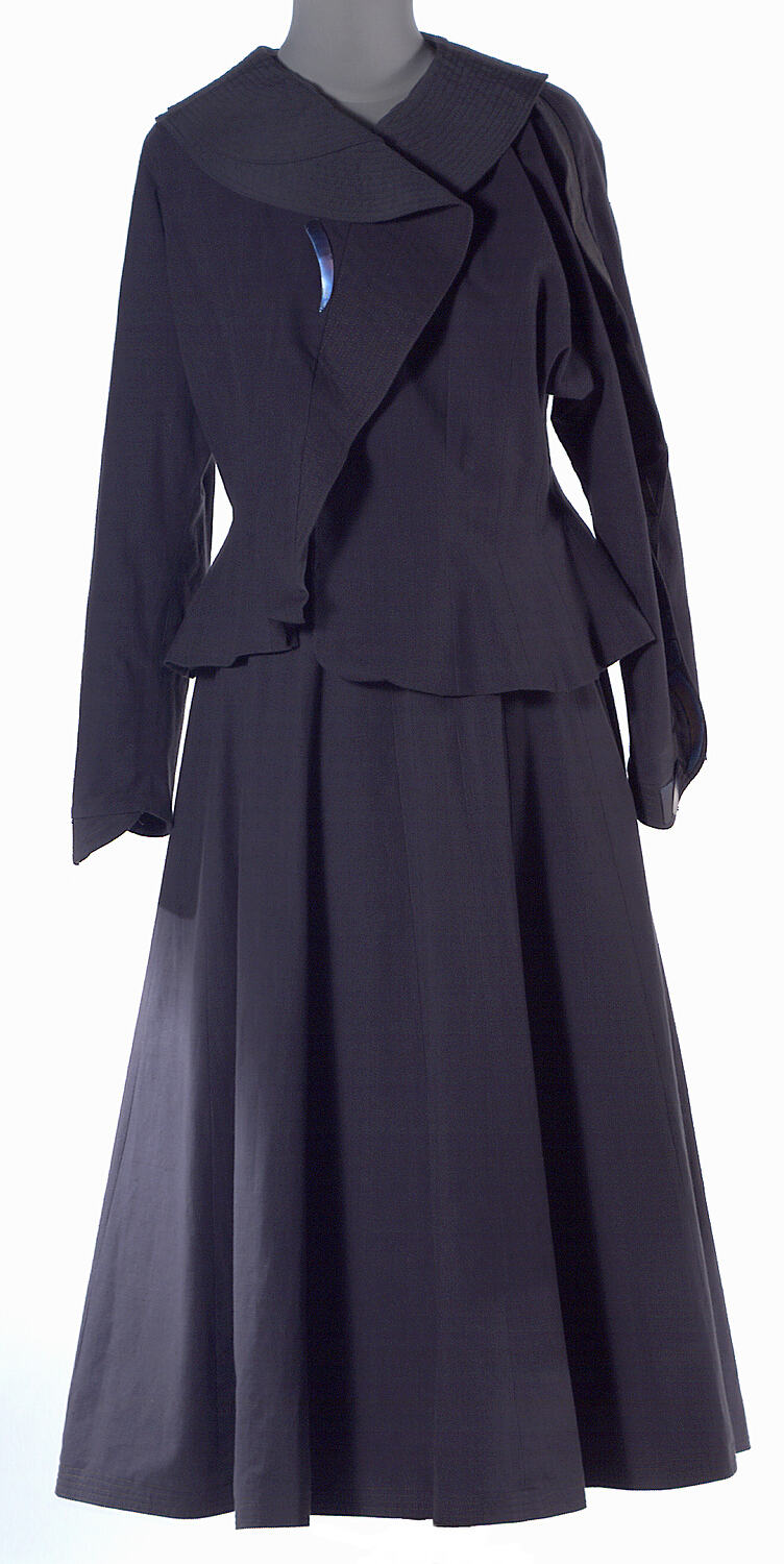 This is a three piece outfit in dark grey tinged with purple, consisting of a jacket, shirt and skirt: (1) Jacket in heavy cotton trimmed with blue/purple titanium slivers. Hip-length and fitted, jacket has stiff 'fins' along sleeves, collar and lapel, which have lines of stitching as decoration. Garment has shoulder pads and is lined in dark grey fabric (silk or polyester) (2) Collarless long-sleeved shirt in silk decorated with titanium slivers at neck and shoulders and printed brown splotches. (3) Mid-calf length skirt in heavy cotton. Very full panelled A-line cut with waistband fastened at side with zip and metal hook.