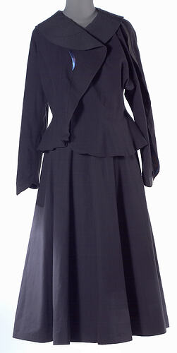 Outfit designed and manufactured in Melbourne by Prue Acton P/L in 1983. It was worn by the donor to the 1983 Melbourne Cup. A designer with the company, Maree Menzel, noted that the metal pieces on the jacket were meant to be on the sleeves not the fins, but a mistake was made in production. It was worn with a matching belt, shoes, hat and handbag in the Museum's collectio (SH 942105 - SH 942108) as well as a pair of 'Melbourne Cup' earrings. The outfit was based on a 'Spiral" theme, depicting time, and the stresses on fabric.