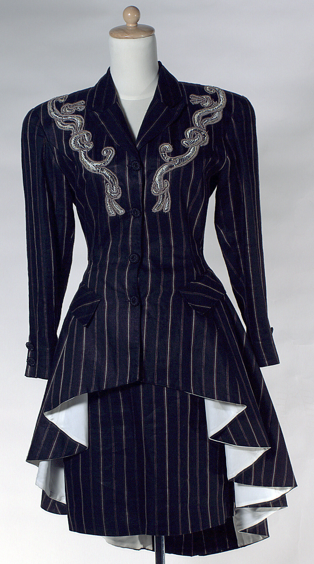 Outfit designed and manufactured in Melbourne by Prue Acton P/L in 1987. It was worn by Acton to the 1987 Melbourne Cup. It was accessorised with a leather bag and straw hat also in the Museum's collection. The theme was based on design of the Dressmaker Dummy, hourglass silhouette.