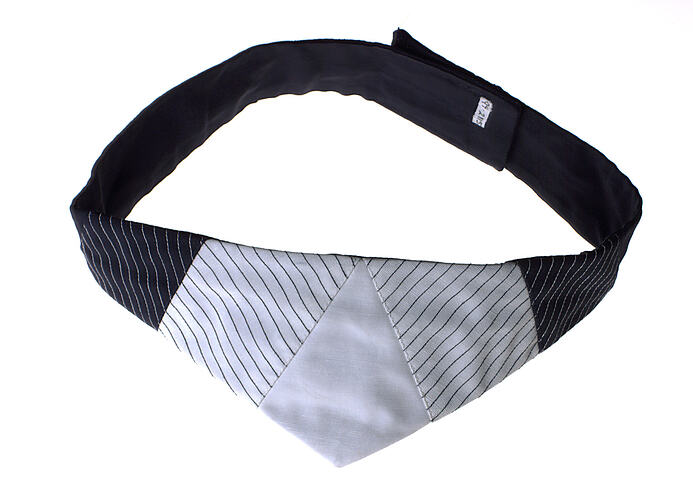 Belt in navy and white gro-grain panels decorated with navy and white stitching. Belt is straight at the sides then peaks up to a point in the centre. Fastened at back with velcro strips.