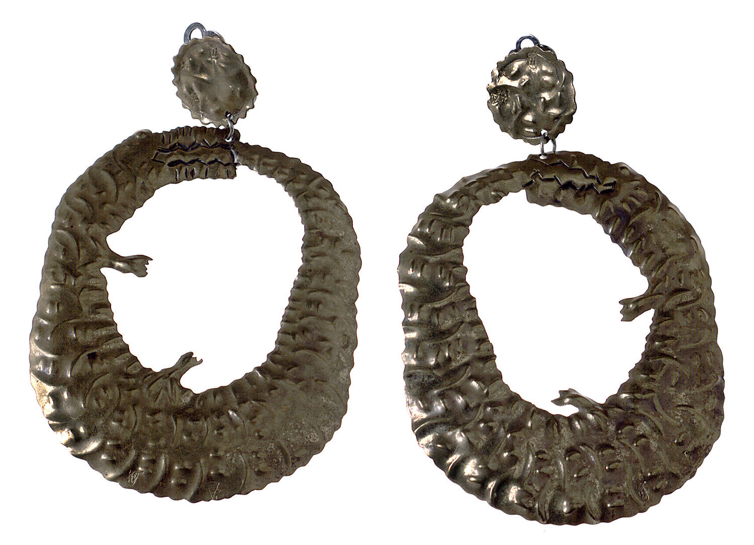 Pair of bronze coloured metal clip-on earrings in the shape of curled up crocodiles.