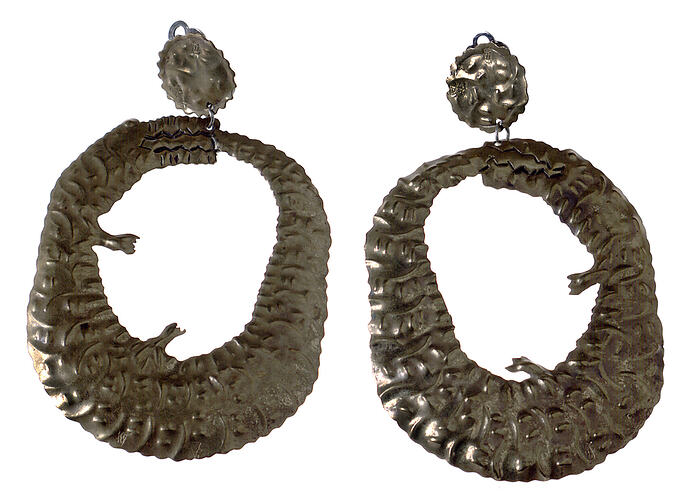 This pair of earrings were commissioned by Prue Acton, probably from the Melbourne jeweller Marcos Davidson in 1986. They were worn by the donor with a `Mock Croc' ensemble (not in the Museum's collection) at the 1986 Melbourne Cup. Marcos Davidson made many pieces of jewellery for Prue Acton.