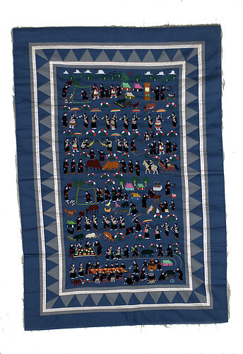 Embroidered Banner made by members of the Hmong community in Victoria, in 1990. It depicts a Hmong celebration. The Victorian Hmong community developed after many Hmong fled from Laos in 1975 and arrived in Australia in mid 1980s after spending time in Thai refugee camps. The women of the Victorian Hmong community produced and sold these types of works at the Fitzroy Craft Market to supplement family income.