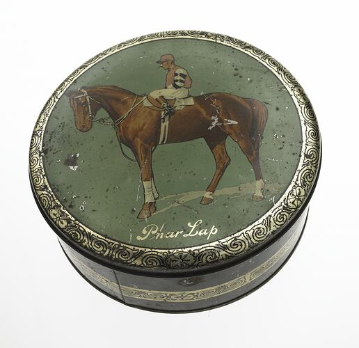 This artefact communicates very effectively how entrepreneurs anticipated that Phar Lap's intense popularity, serviced by print, film and radio, made him a bankable sports personality. Mass produced articles were the perfect commercial complement to the widely accessible media hero. The use of Phar Lap on a cake tin suggests new levels of commercial exploitation associated with fame.
