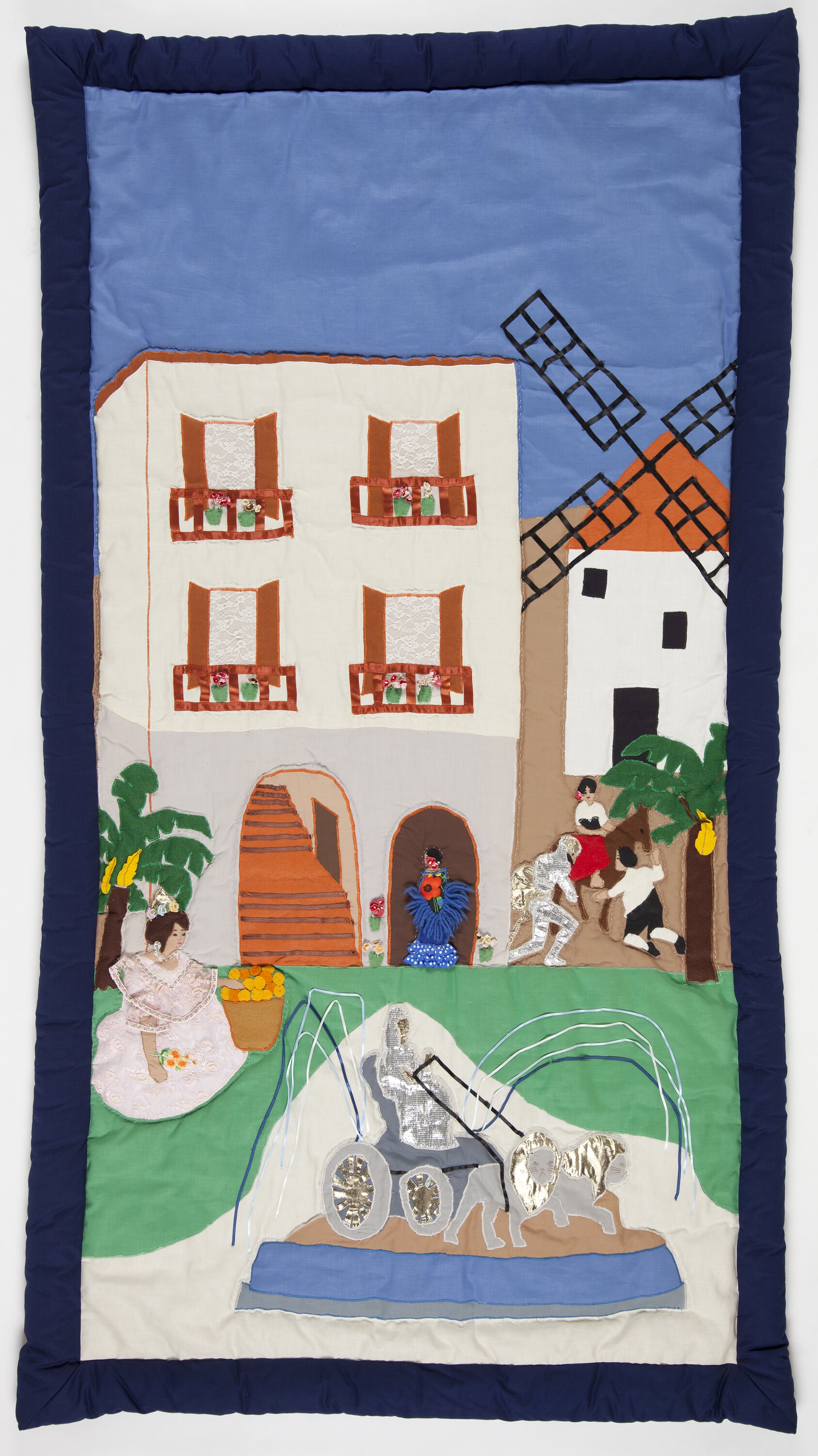 Quilted wall hanging using various materials sewn to the quilt to portray a Spanish scene. Pictured is a building with four windows, each of which has flowers on its balcony. Next to the building is a windmill at the base of which is a lady on donkey and two gentlemen. In the doorway of the building is a lady who appears to be wearing a flamenco costume. Another female sits under what appears to be a banana tree wearing a pink dress with a large lace collar. In foreground is a chariot pulled by two lions riding on which is a figure dressed in silver. The appears to be part of a fountain. The wall hanging is framed by a navy blue border.