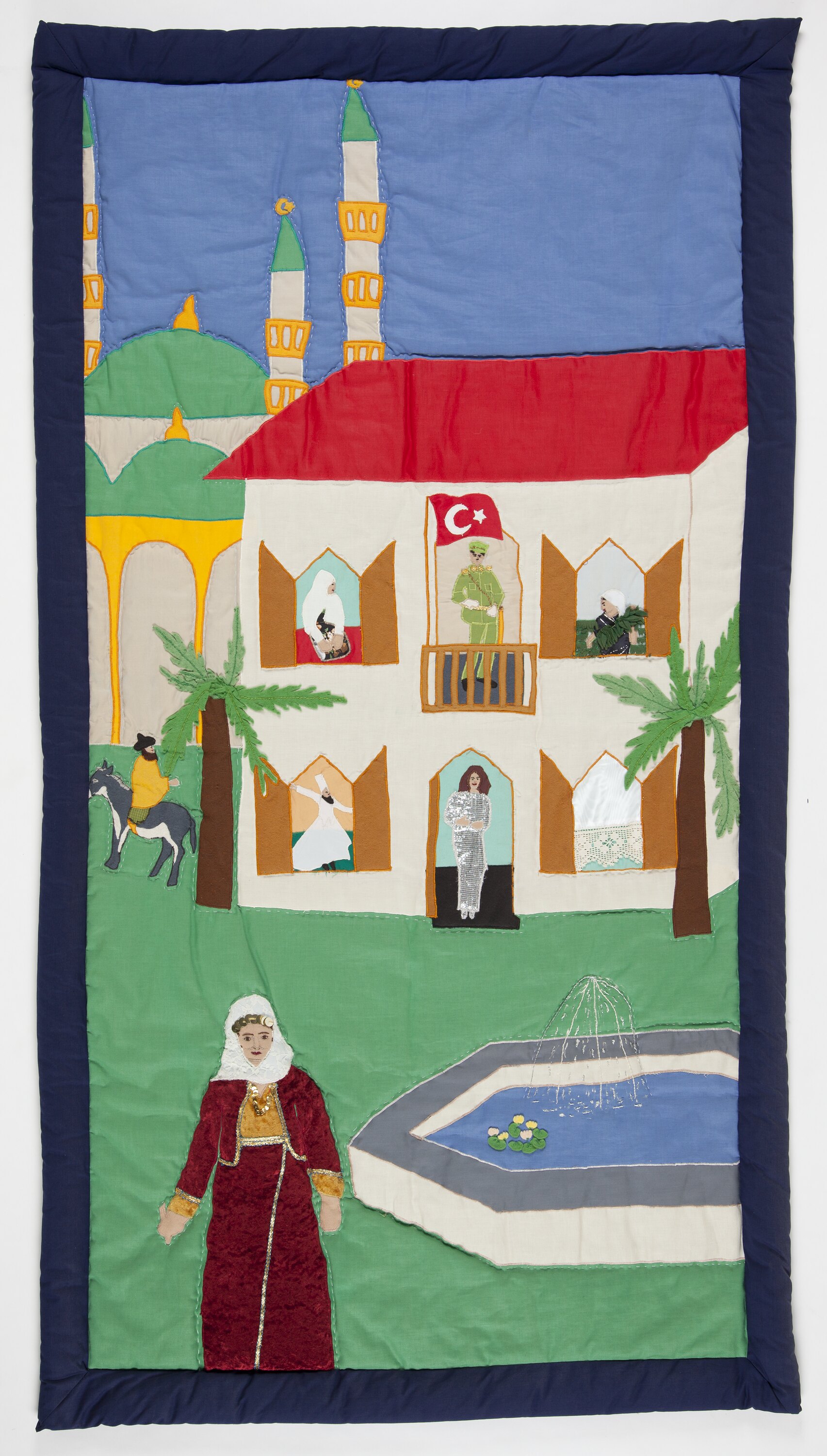 Quilted wall hanging with various materials sewn to it to portray a Turkish scene. Pictured is a large cream building with a red roof. In the windows are images of people engaging in various activities and dressed in different costumes. Behind the building is a mosque with green domes and tall spires. In the foreground is female wearing what appears to be a traditional costume. She is standing next to a fountain. The wall hanging is framed by a navy blue border.