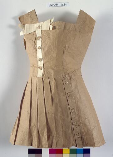 The pattern is of brown paper, with trimming of cream paper on the right-hand side; it is sleeveless with a square neckline, and trimmed with brown paper buttons . The skirt is pleated and the pattern has been assembled and sewn with white cotton.